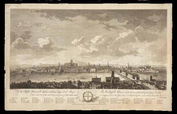 To the Right Honourable Brass Crosby Esqr. Lord Mayor the Worshipfull Aldermen & the Common Council of the City of London. This South View of the said City and part of Southwarke as it appeared about the year 1599 is Dedicated by their most obedient humble Servant.