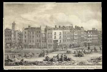The aerial view looks over Southwark towards the River Thames and London Bridge, with notable points, ranging from Queen Hythe, to St Saviour’s Church, to “The Stews”, to St Thomas’s Hospital, detailed using a 20-point key, set out below the image. Also depicted is Borough, a market-town which had been populated since early Saxon times and, by the Middle Ages, had become a notorious hot-bed of criminality. In the mid-sixteenth century it became known as the “Bridge Ward Without”, or the ward of “Bridge Without”.