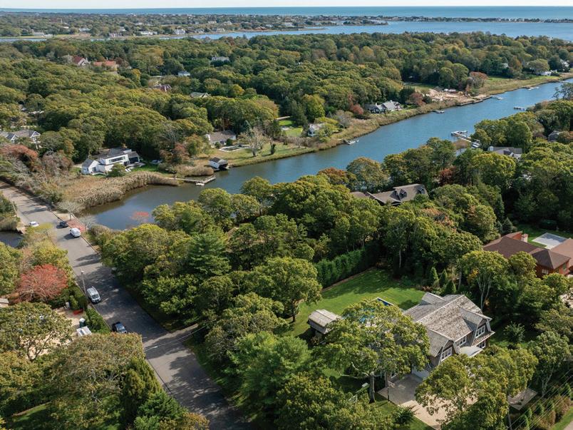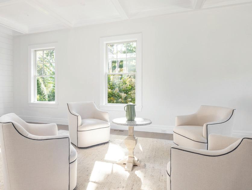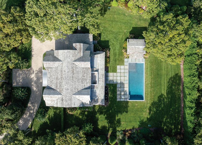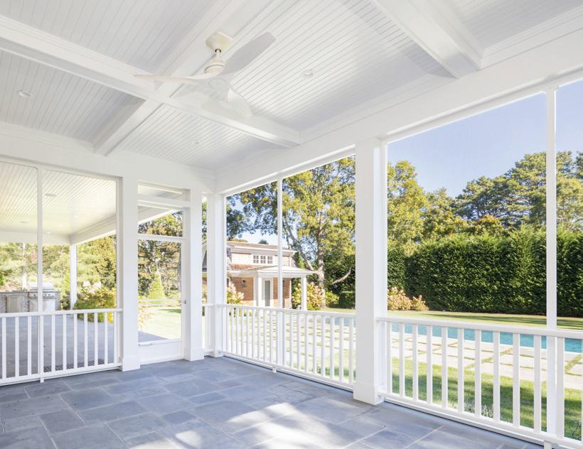 The private quarters include five gracious ensuite bedrooms, each offering generous proportions and refined finishes. The primary suite is a sanctuary unto itself, complete with spa-like bath and private sun terrace overlooking the grounds. The expansive lower level, with soaring 10’ ceilings, is designed for recreation and relaxation. A state-ofthe-art gym with full bath, sauna, spacious media lounge and theatre create the ultimate Hamptons retreat experience.