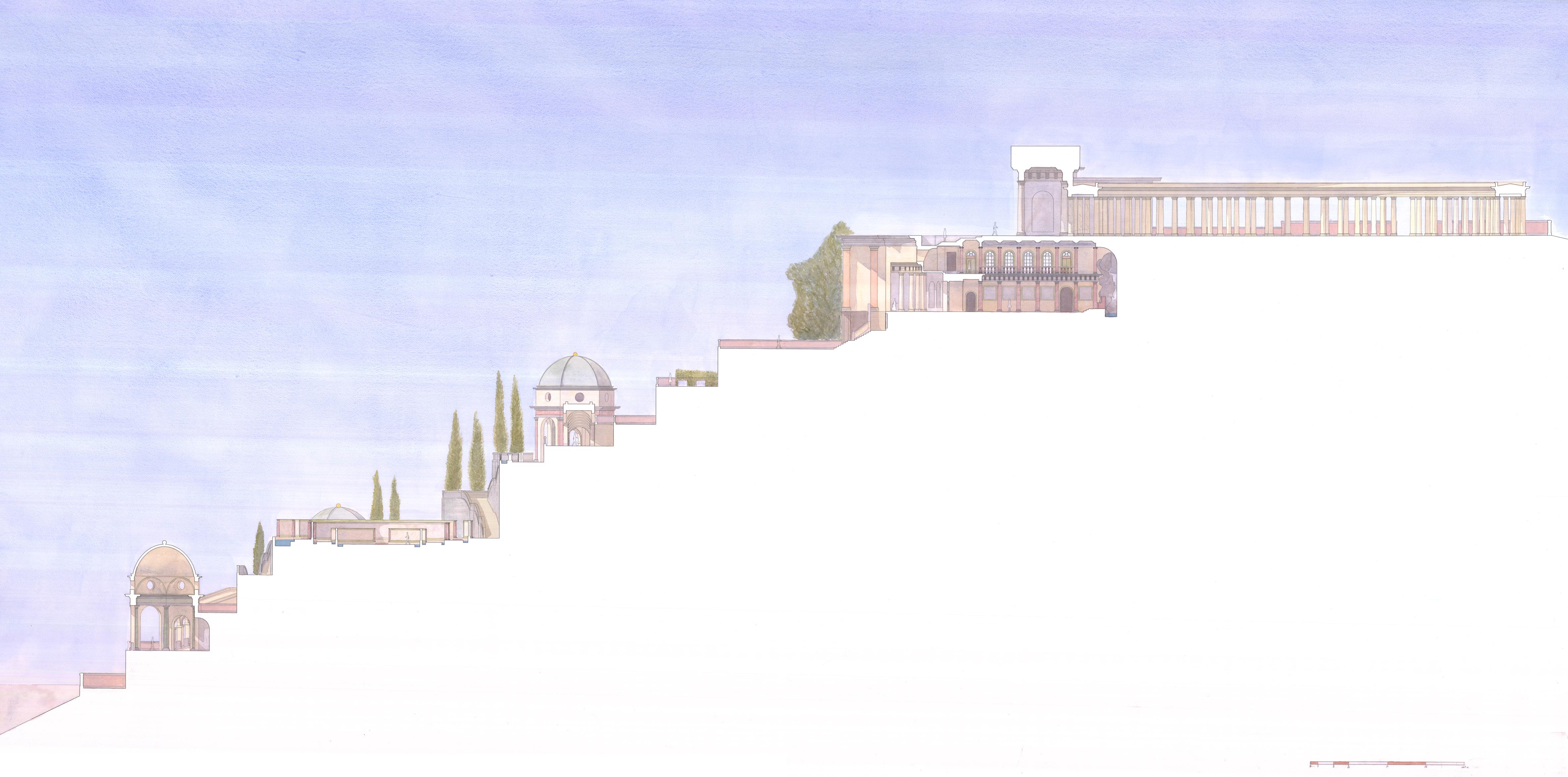 The sections illustrate various terraces containing tombs and monuments throughout the site. A grotto is situated at the rear of the main ceremony building.