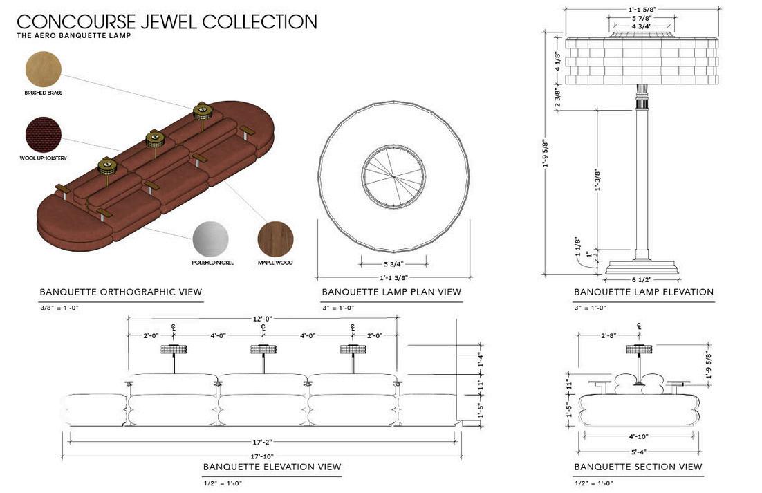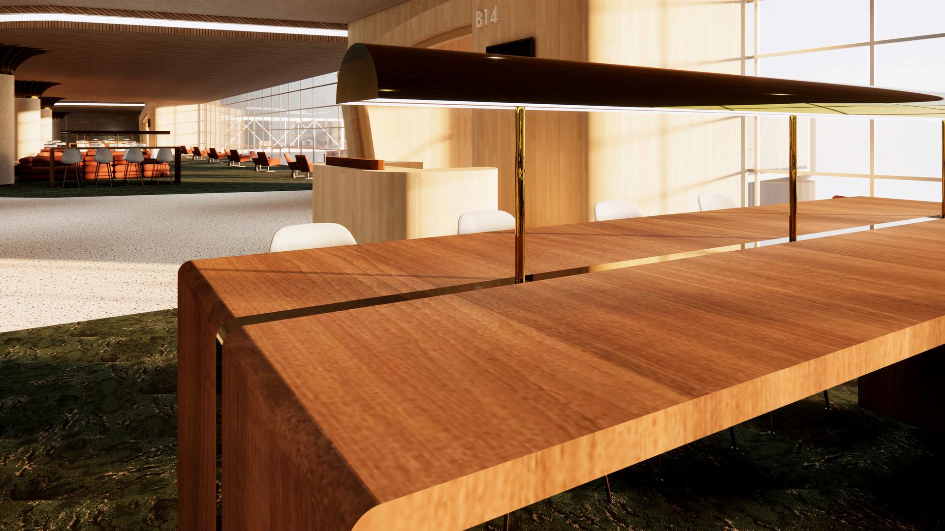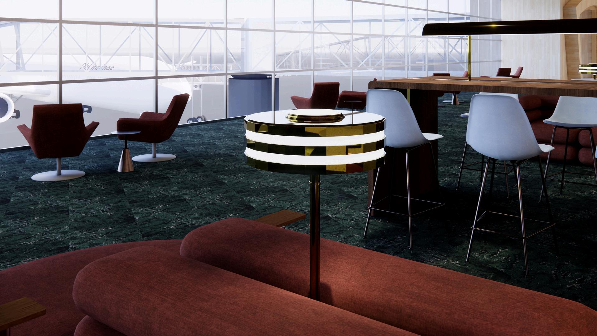 The luminaire collection includes brass lamps positioned between banquette benches and a brass library-inspired lamp at the tall communal tables These fixtures provide diffused lighting for waiting and conversation, as well as focused task lighting for reading, working, or charging devices. Together, the fixtures transform the boarding gate lounge into a welcoming destination within the concourse and encourages passengers to linger, recharge, and reconnectwith the romance and anticipation of travel.