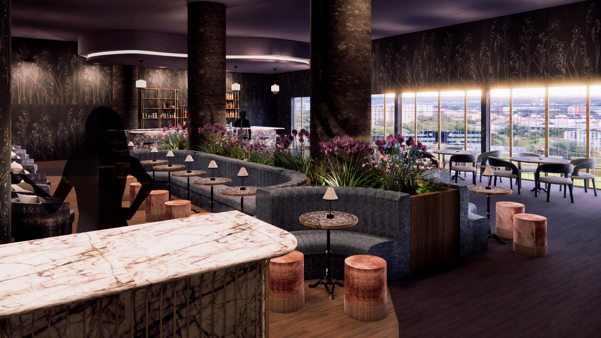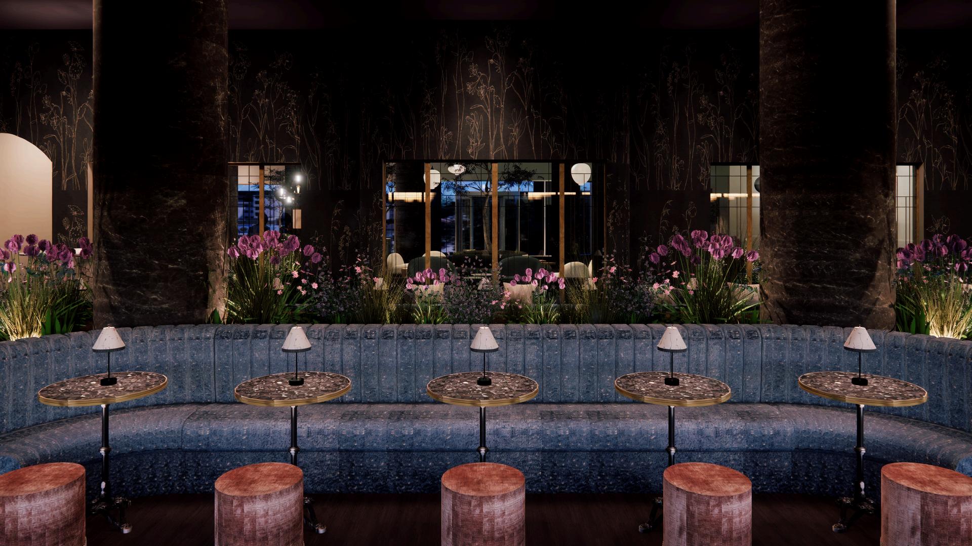 The material palette is layered with bits of whimsy, from the House of Hackney upholstery and wallpapered columns, the patterns and botanical motifs mix together to create a sense of romantic maximalism. The antique mirrored backsplashes behind the bar add depth to enhance the atmosphere, while a gilded ceiling treatment by Arte brings luminosity and warmth to the private dining space.The palette draws from a double complementaryscheme of deep reds, brassy ochres, muted greens, and dusty blues, shifting from light and botanical bydayto moodyand immersive bynight.