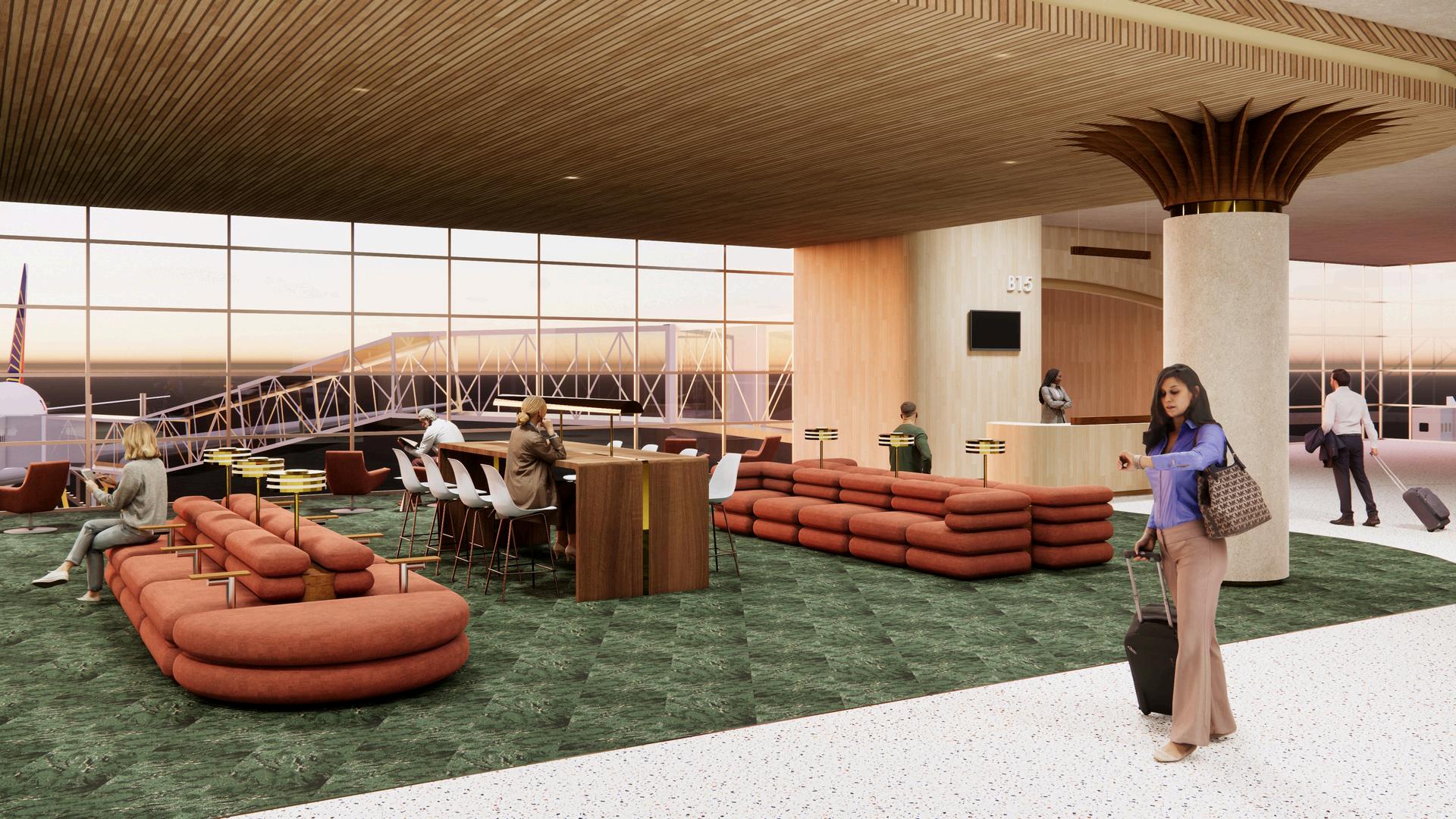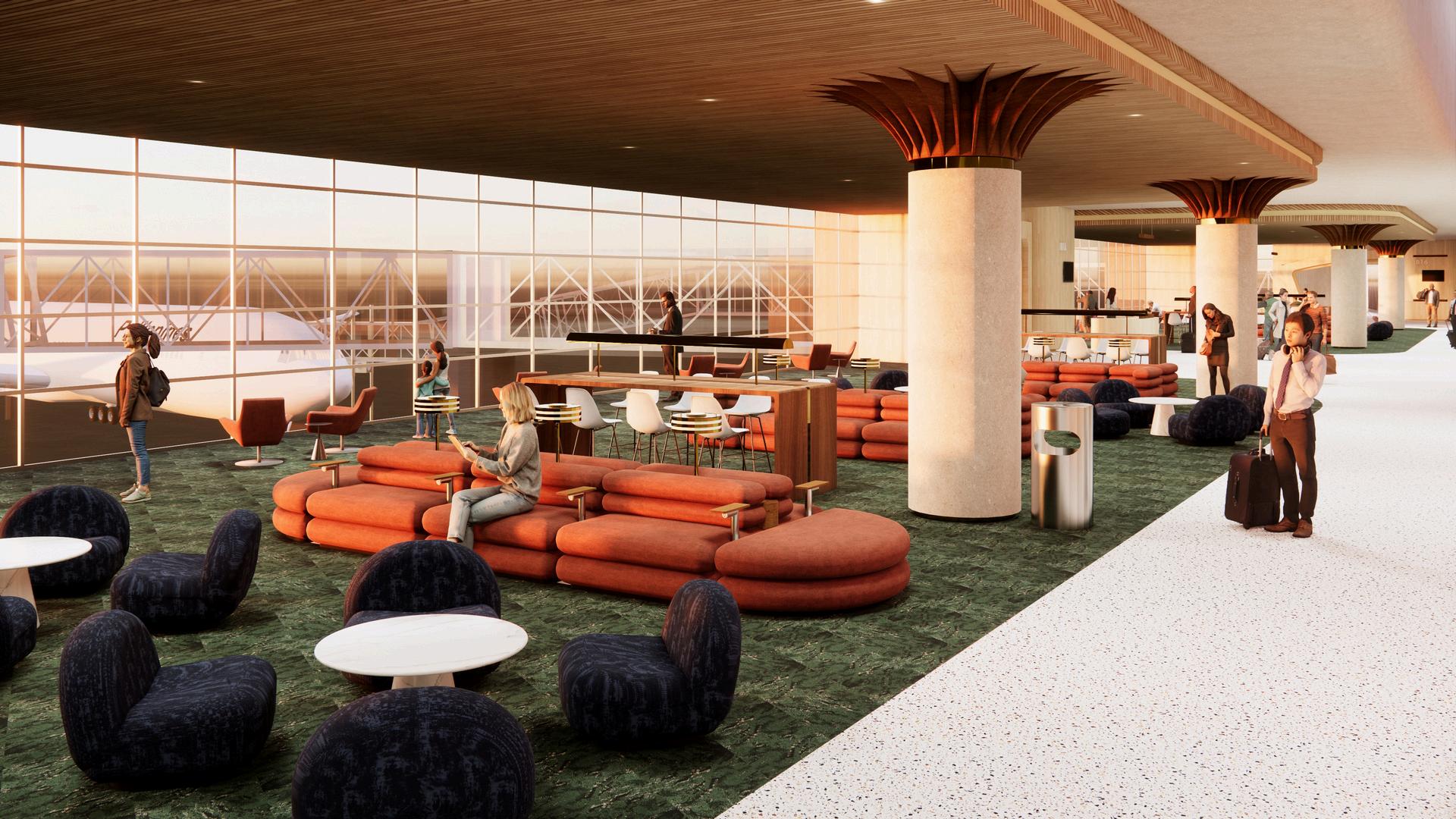 The lounge is designed to feel more like a living room than awaiting area, blending midcenturymodern influencewith a balance of geometric forms The boarding gate lounge features a jewel-toned green carpet, deep redwool upholstery, and blue boucle swivel chairs, aswell as polished cement pillarswithwood and brass accents, and terrazzo floors forhigh trafficwalkways.The lighting reinforces this atmosphere through multiple layers of illumination that support comfort and function