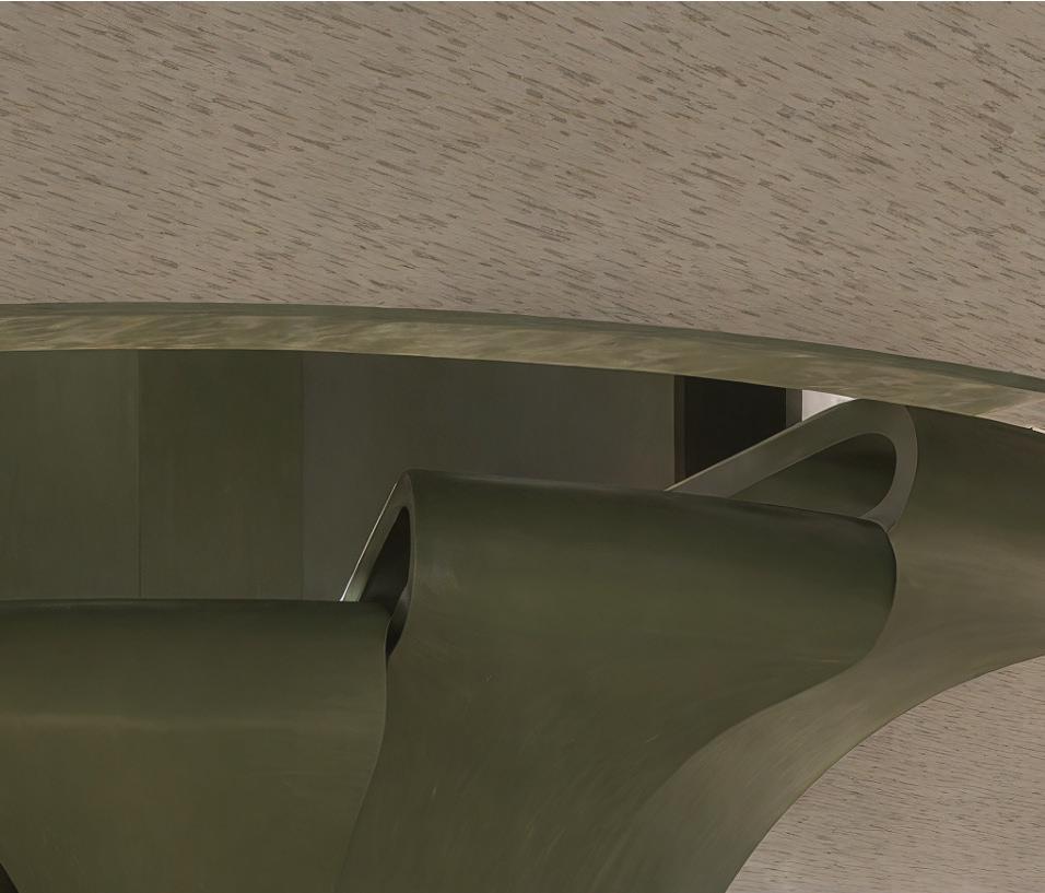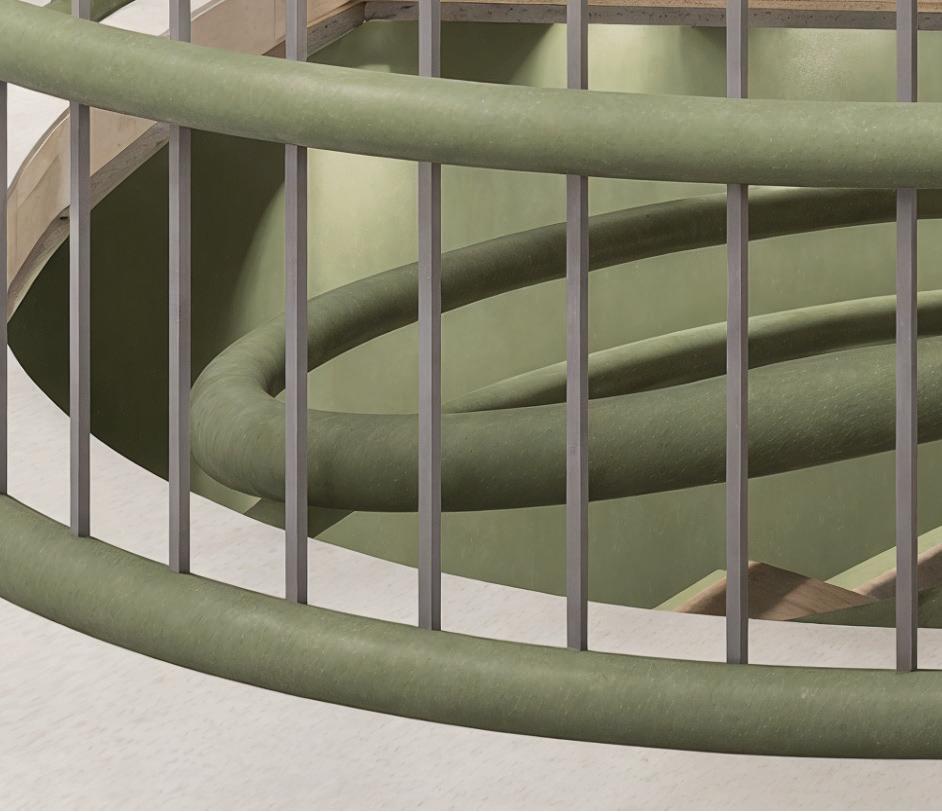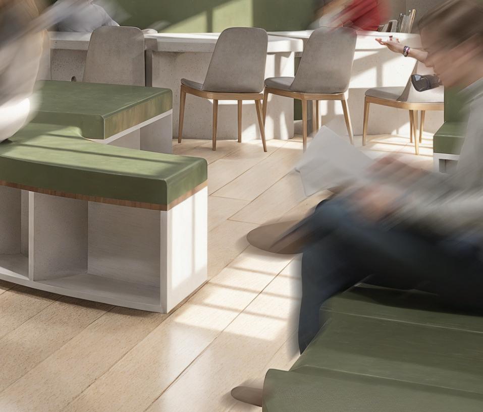 The modular units are conceived as rotating fragments that orbit the columns, forming curved seating, shelving, and table configurations. Each piece can be rearranged, expanded, or nested to accommodate different social conditions — from intimate dialogue to collective study or rest. The geometry promotes circular movement and visual continuity, dissolving boundaries between individuals and inviting spontaneous encounters.