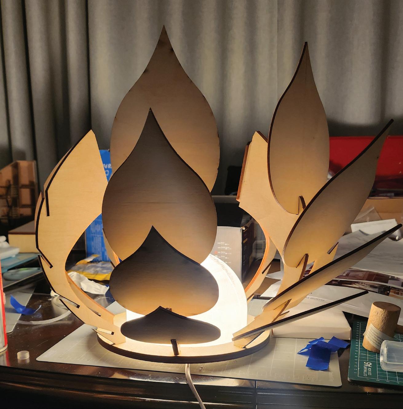 The Lotus lamp is a design that follows the precedent of the artichoke lamp and reconstituted it from a hanging ceiling piece into a table light. The modification made to the lamp allows for ease of construction and simplifies the fabrication process while maintaining the same construction method of aligning plates onto stems with slits.