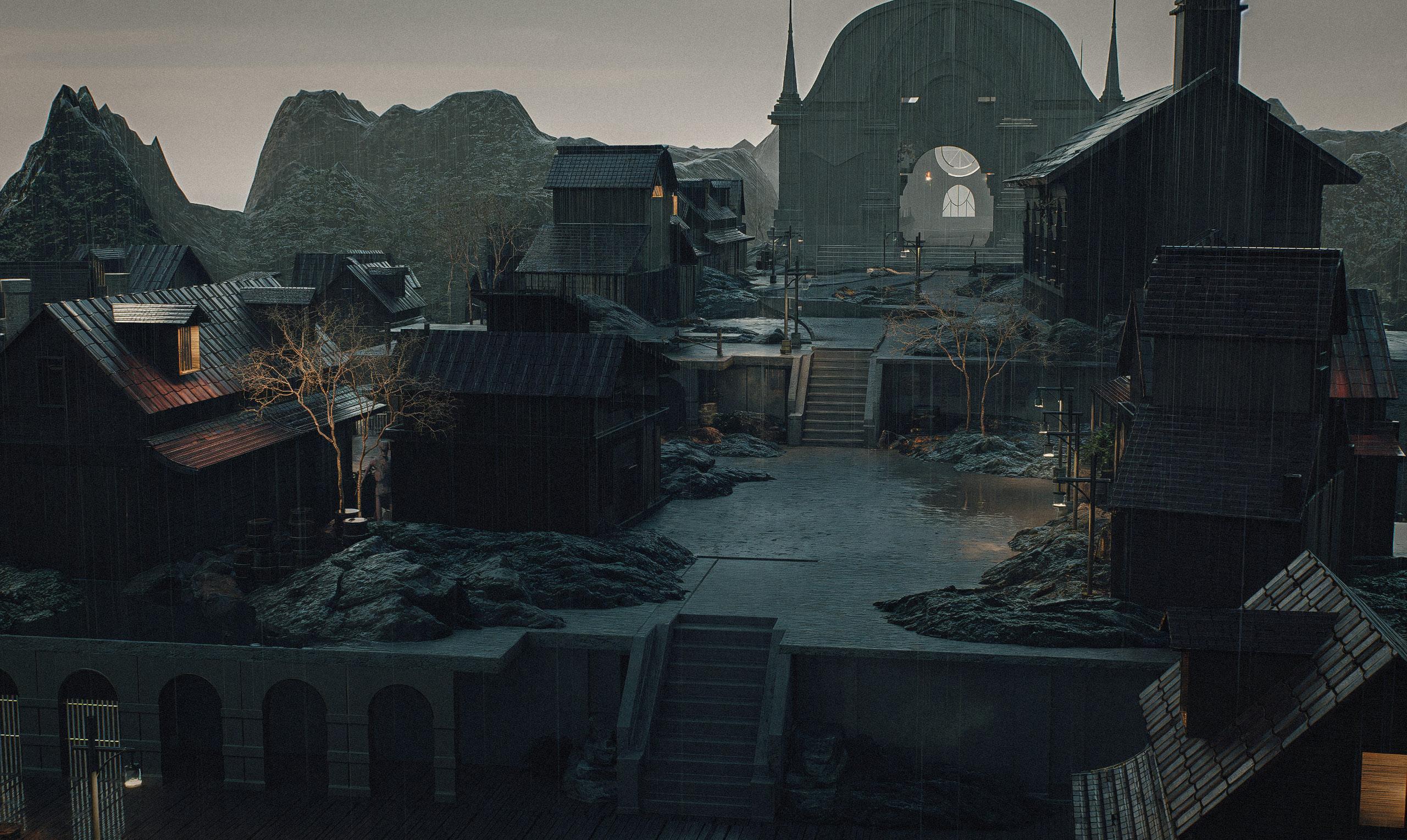The town is modeled as a fragmented coastal settlement—weathered structures, collapsed piers, and fog-obscured horizons suggesting both maritime history and metaphysical passage. Spatial composition emphasizes depth, obscured sightlines, and gradual revelation, allowing tension to build through movement.