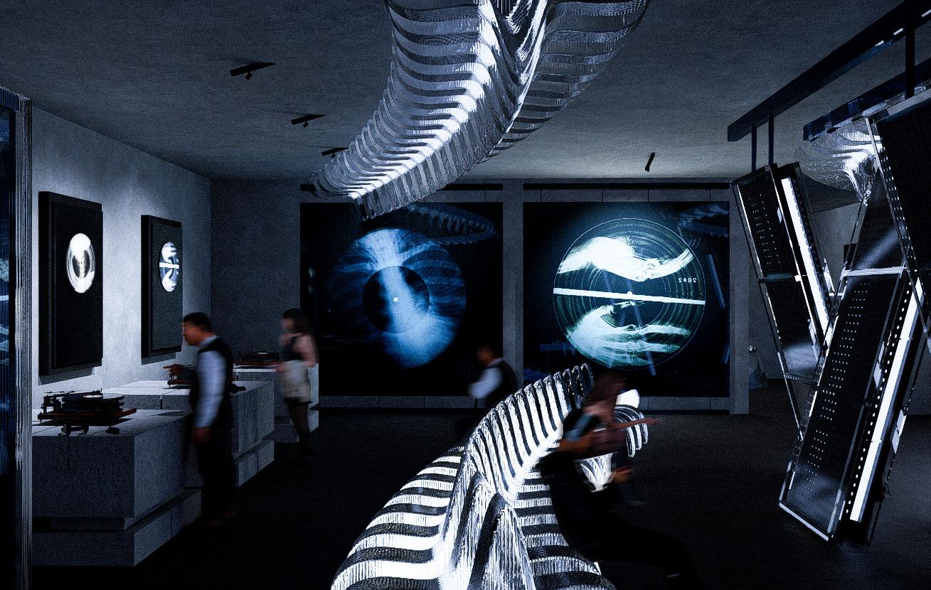 Bone Music reimagines the underground culture of Cold War bootlegging through a spatial narrative of memory, resistance, and transmission. The project draws from the phenomenon of X-ray records—music etched into discarded medical films—and translates this act of improvisation into architecture.