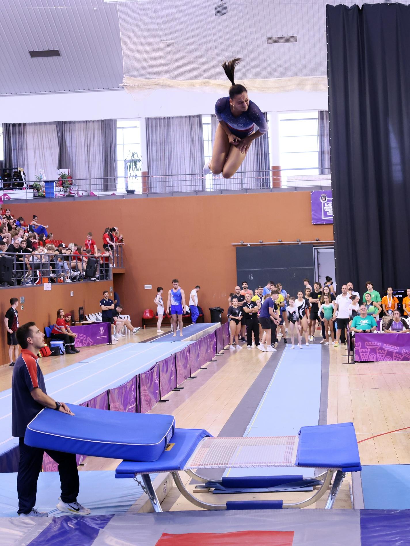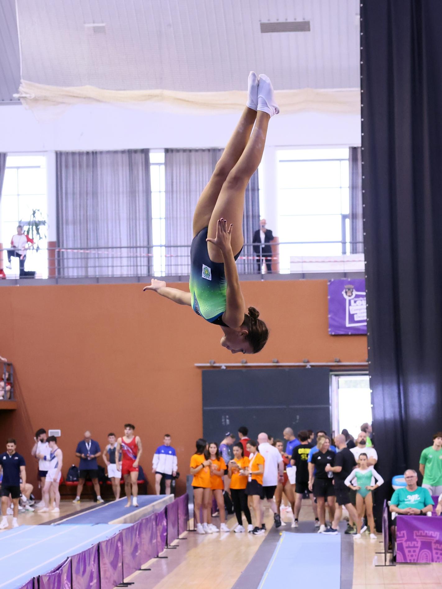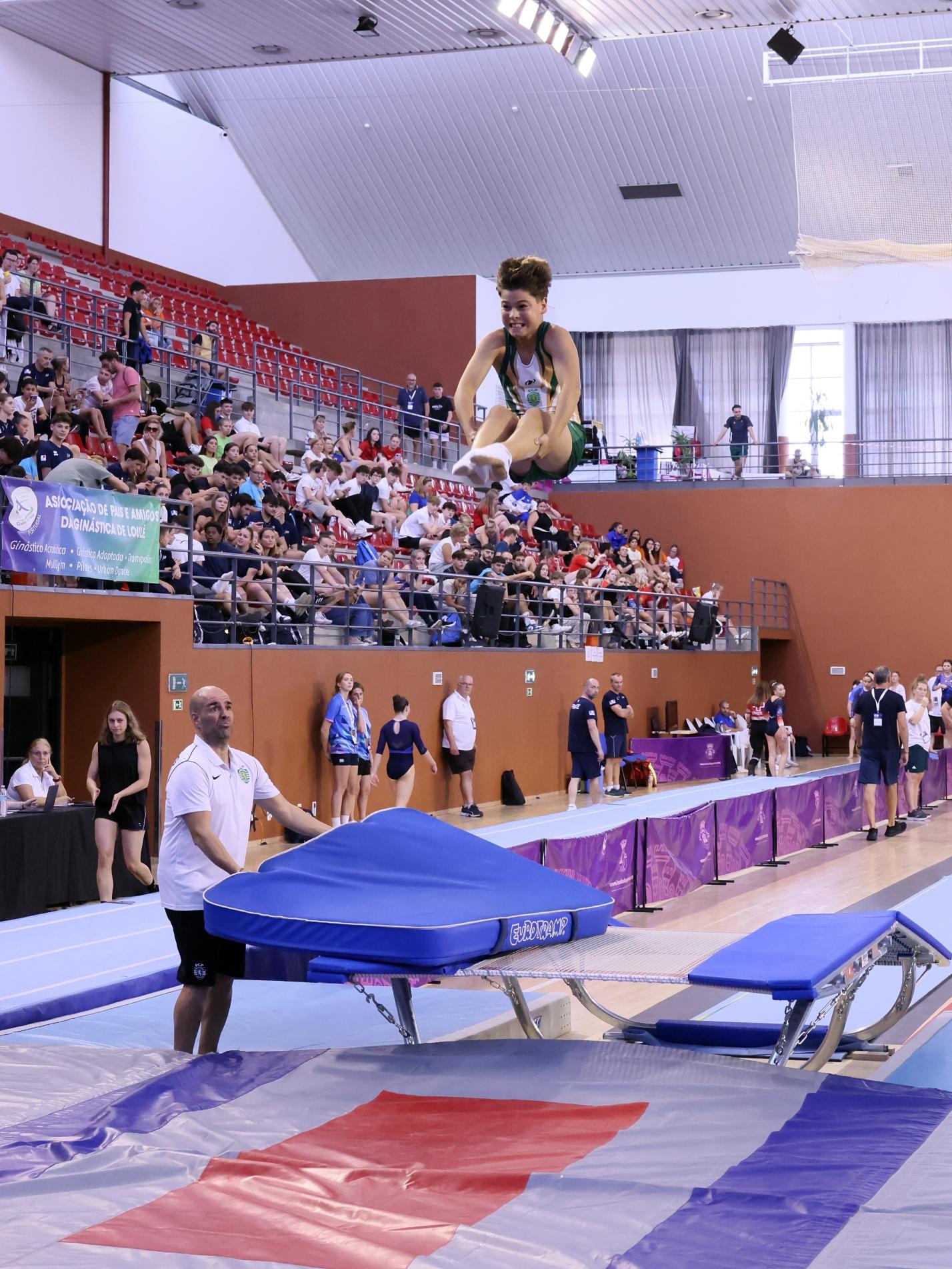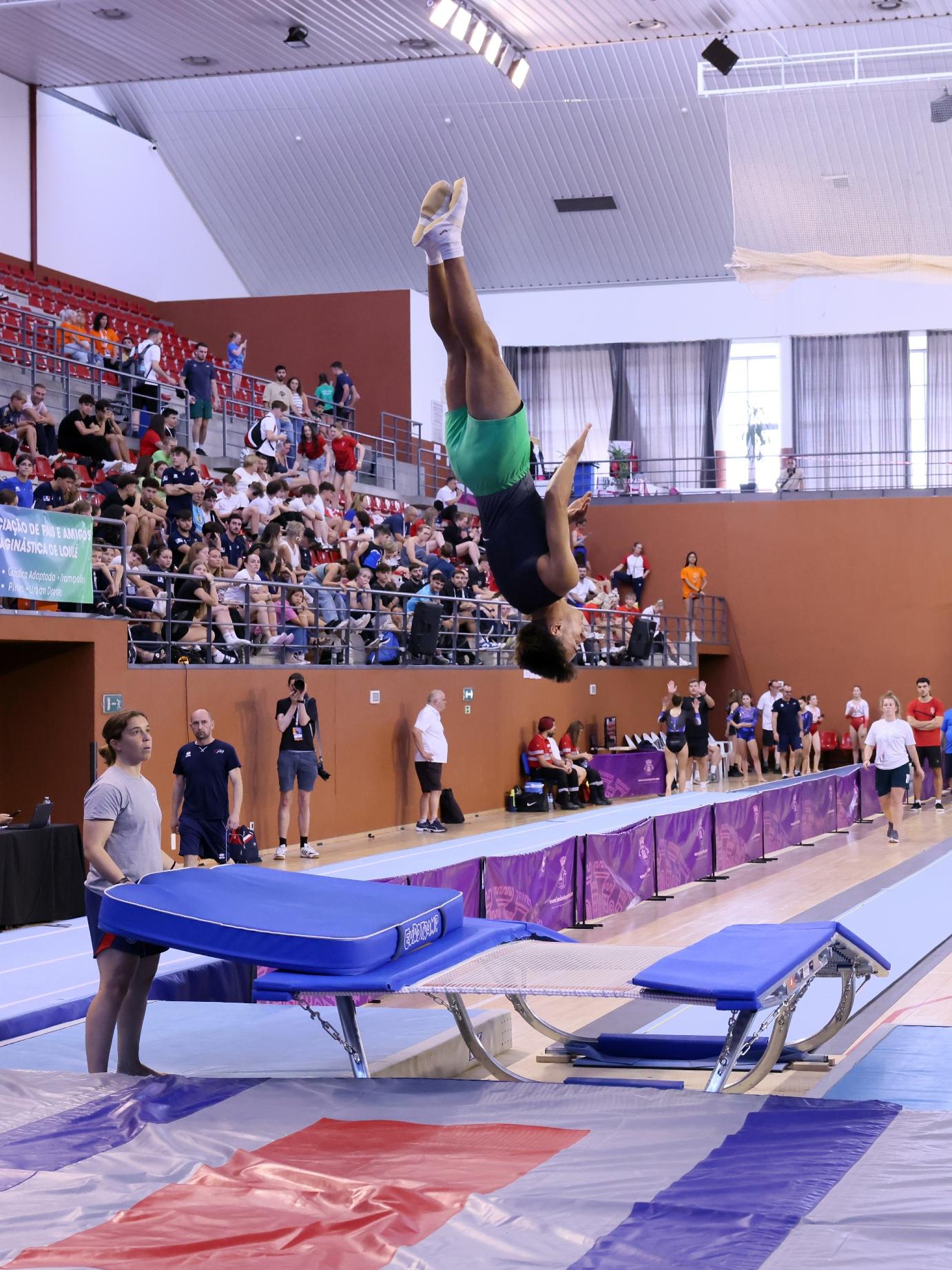 trampolim, duplo mini-trampolim e tumbling. Atletas provenientes de dezenas de países europeus e do resto do mundo, muitos deles detentores de medalhas de ouro, prata e bronze em Campeonatos do Mundo e da Europa destas exigentes modalidades, e que levaram ao rubro o muito público que encheu as bancadas do Pavilhão.