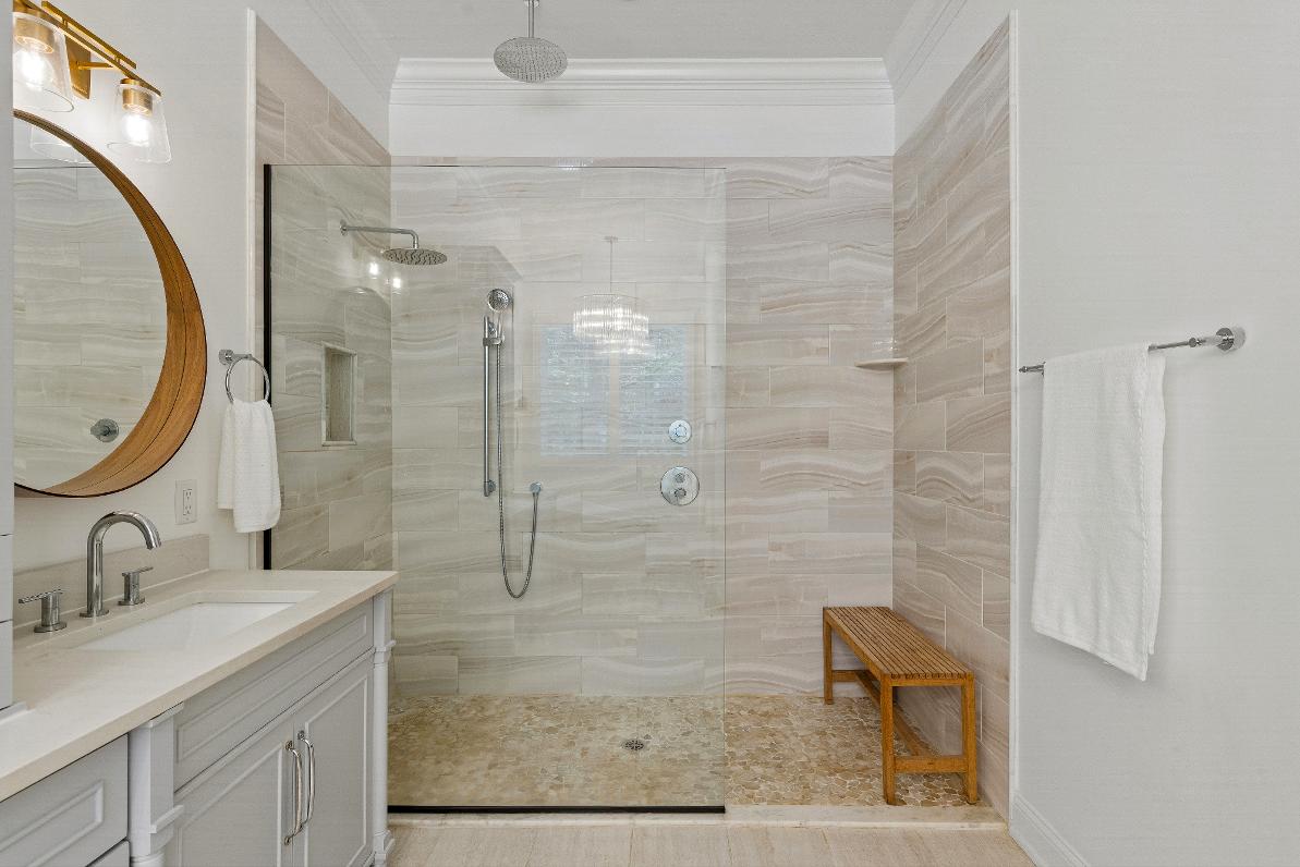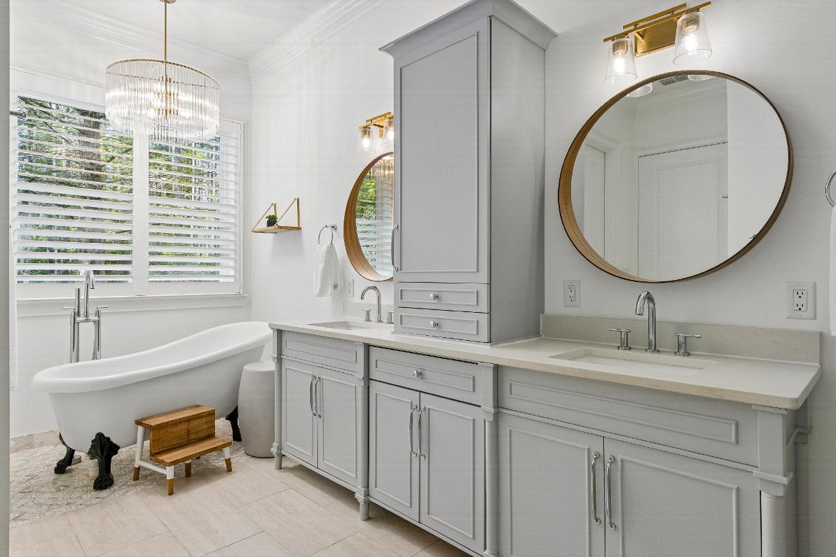 - Updated primary bathroom cabinetry and countertops,added new mirrors and refined lighting,and incorporated ample storage for towels and toiletries,complemented by a clawfoot soaking tub,creating a more functional,spa-like space with a seamless coastal aesthetic
