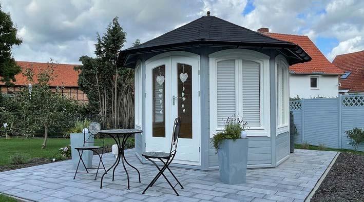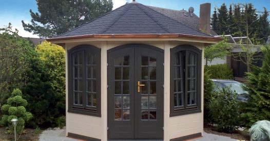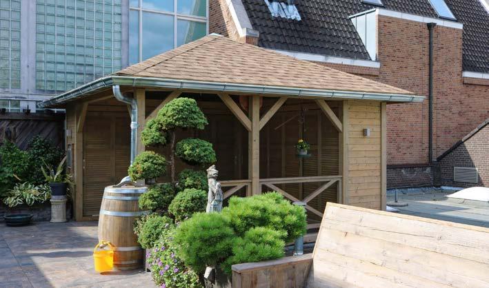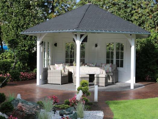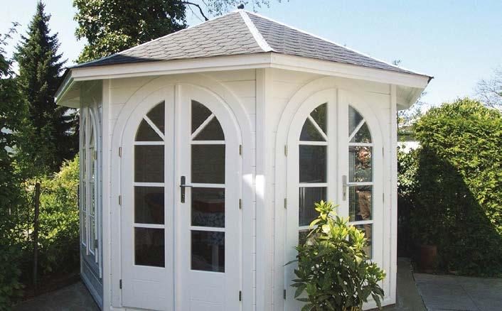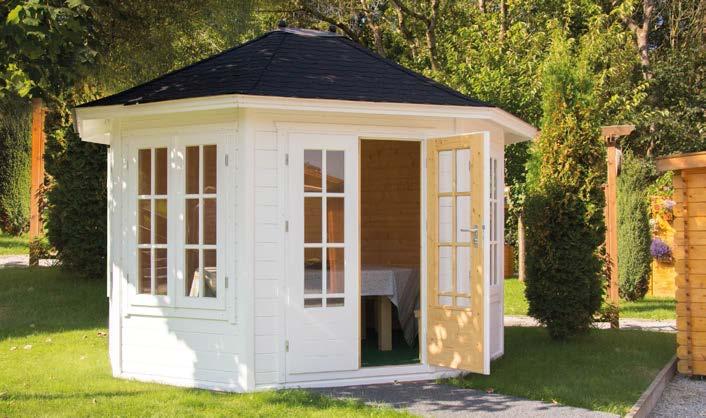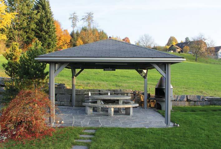 • Bei den Pavillonmodellen (max. Durchmesser 4,0 m) sind die Dachflächenelemente ebenfalls fertig vormontiert und können auf Wunsch beschindelt geliefert werden.