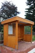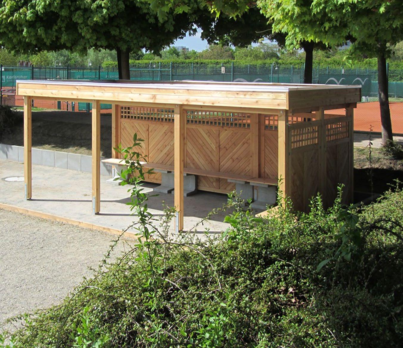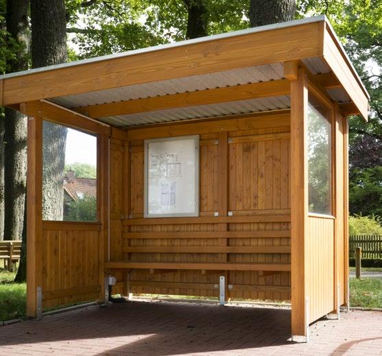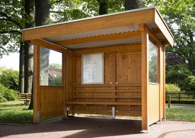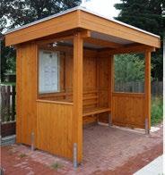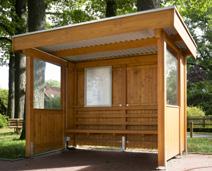 Aufbau mit 7 Pfosten 11 x 11 cm, Länge 2,10 m, Flachdach aus Stahl-Trapezplatten, Oberseite farbig beschichtet anthrazitgrau, Unterseite mit Antitropfschutz, dreiseitige Blendenabdeckung aus Aluminium Stucco blank, rückseitige Regenrinne (braun) mit Fallrohr, Ausführung System SCHEERER. Verkleidung dreiseitig: Wandelemente Wedemark, seitlich jeweils ein Fenster ca. 1,00 x 1,10 m (ESG Glas). Verwendung zum Beispiel als Bus-, Rast- oder Trainerhäuschen.