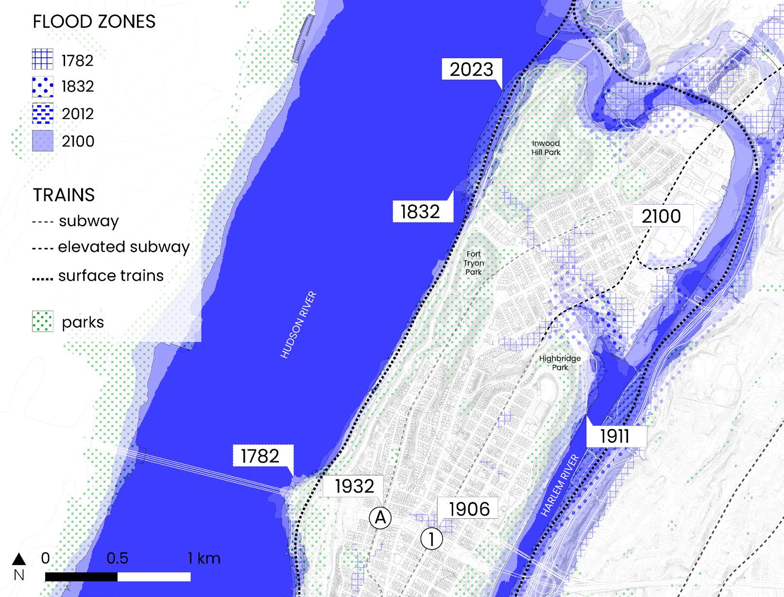 Examining the Northern Manhattan area’s urbanization processes, the study aims to contribute to creating alternative narratives for a more equitable eco-social future. As the creek was covered and displaced, so did its people, the flooding reminds us that rivers come back, so do its people.