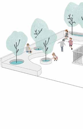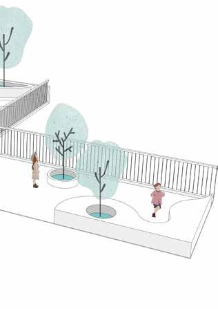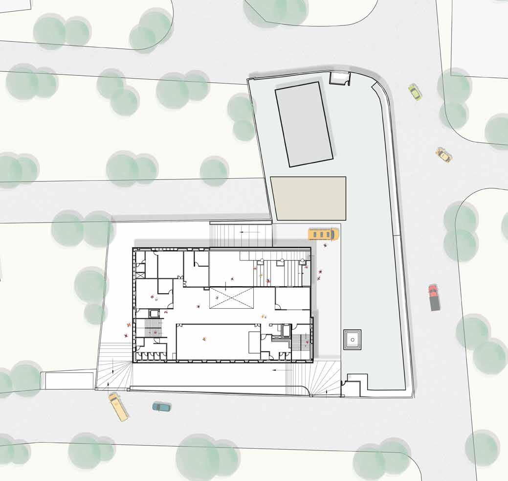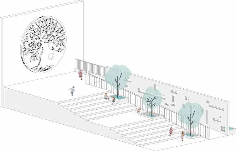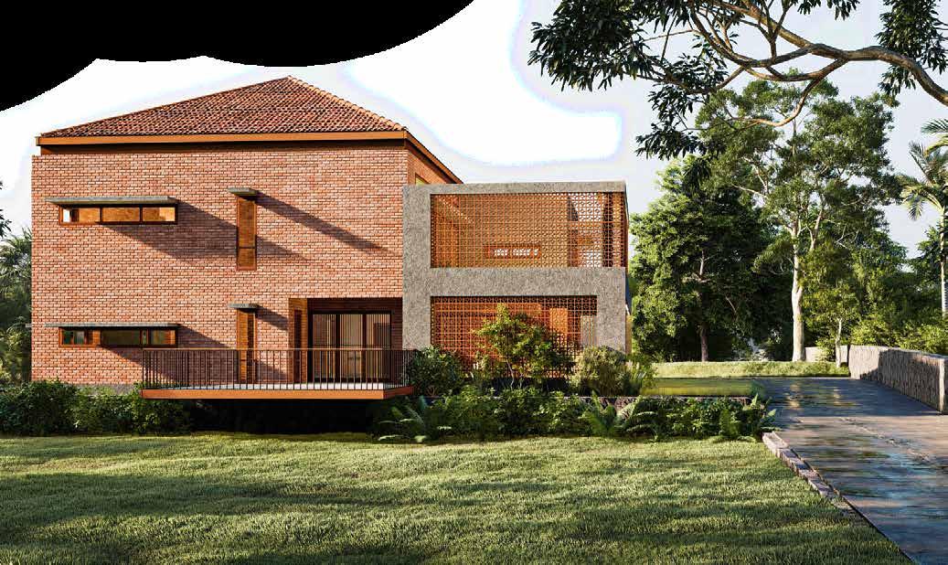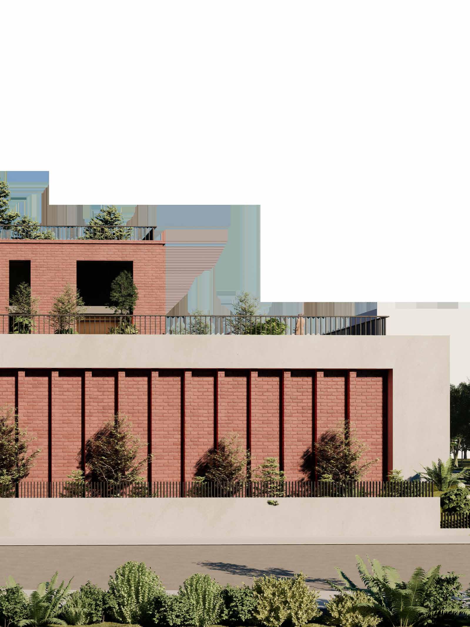 A school built with materials like brick and touches of exposed concrete combines durability with a modern aesthetic, fostering a sense of stability and timelessness. Incorporating green spaces within the building, such as indoor gardens or enhances this environment, creating a serene and inspiring atmosphere.