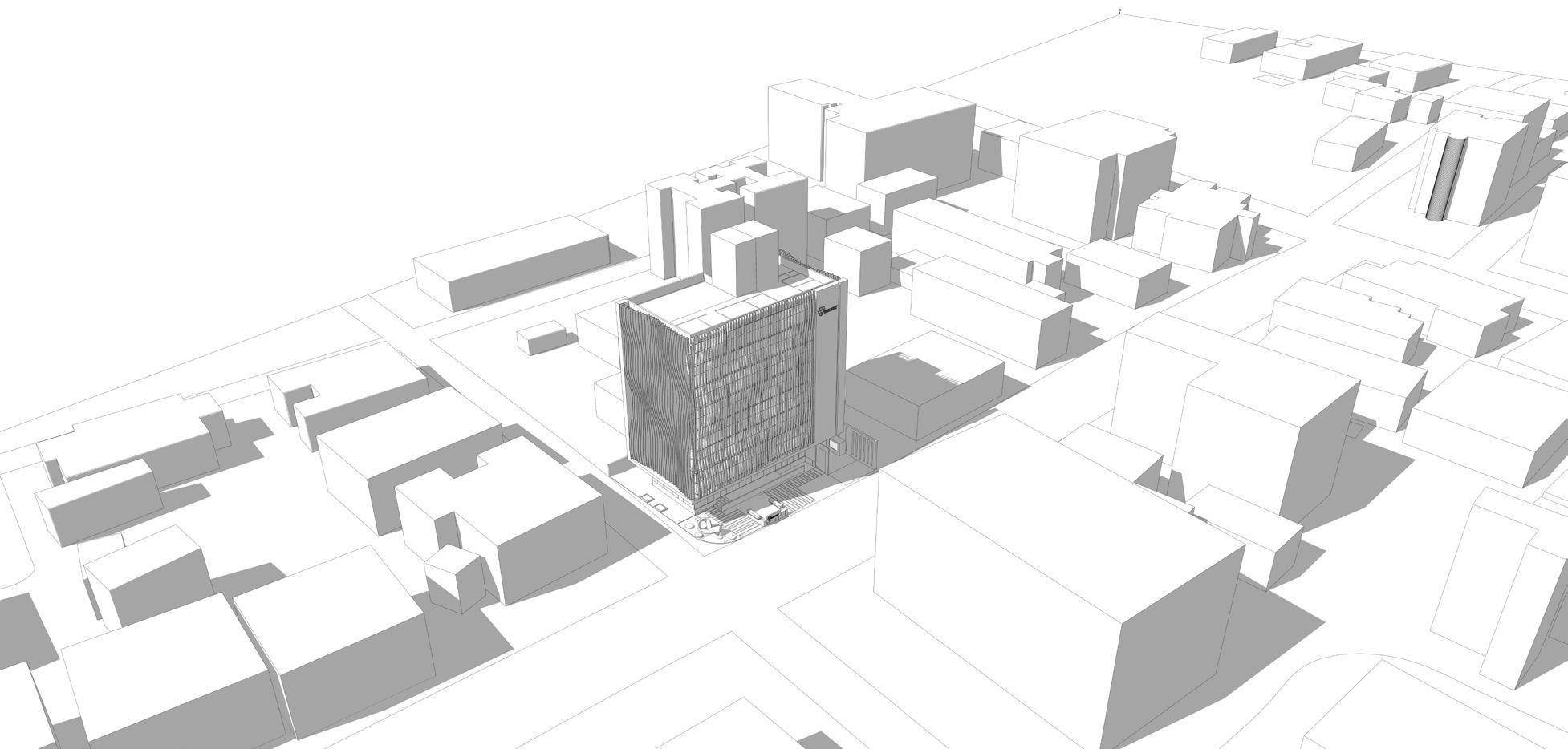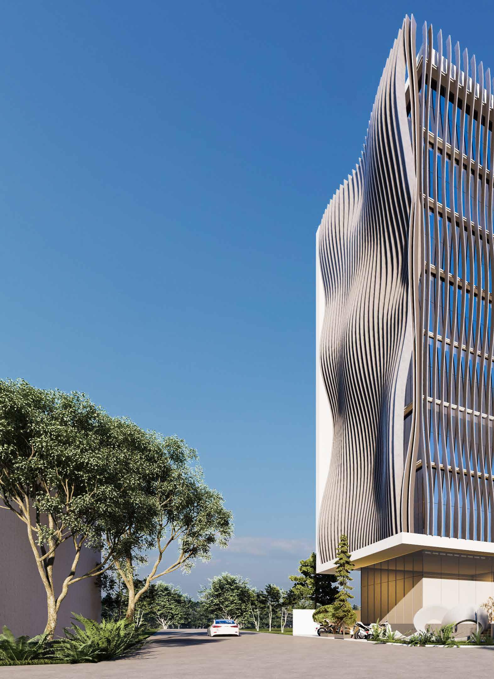 Nestled between diverse residential and commercial buildings, the office building boasts a meticulously designed facade that harmonizes with the sun’s movement across the site. This parametric facade, crafted with precision, features a wavy pattern that evokes the gentle ripple of water, bringing a dynamic aesthetic to the urban landscape. As sunlight dances across its undulating surface, the building not only stands as a functional workspace but also as an architectural landmark that enhances and unifies the surrounding area.