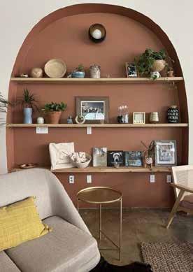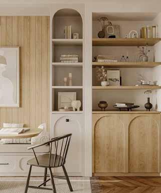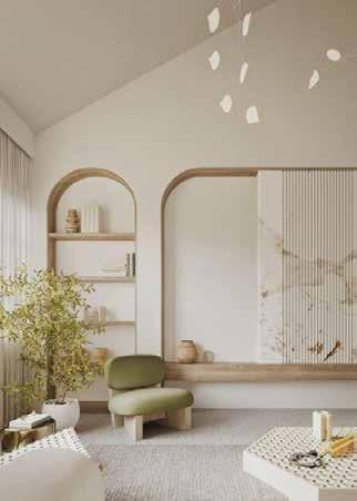 Arched partition walls with a touch of wood and a combination of wallpaper and minimal furniture