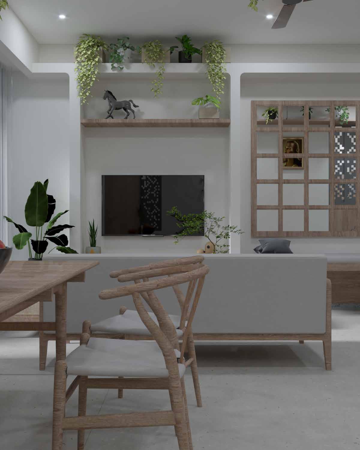 This stylish apartment boasts a linear layout with a single opening that leads to a charming balcony. The space is thoughtfully subdivided, featuring a striking wall adorned with potted plants and neatly arranged books. This design element not only enhances the aesthetics but also infuses the apartment with a modern, inviting ambiance. The seamless blend of greenery and literature creates a serene and visually appealing living environment, perfect for relaxation and inspiration.