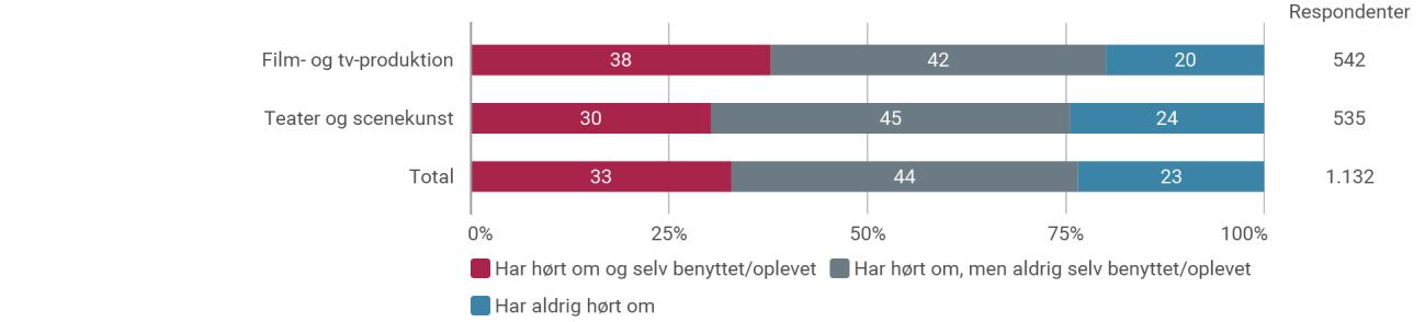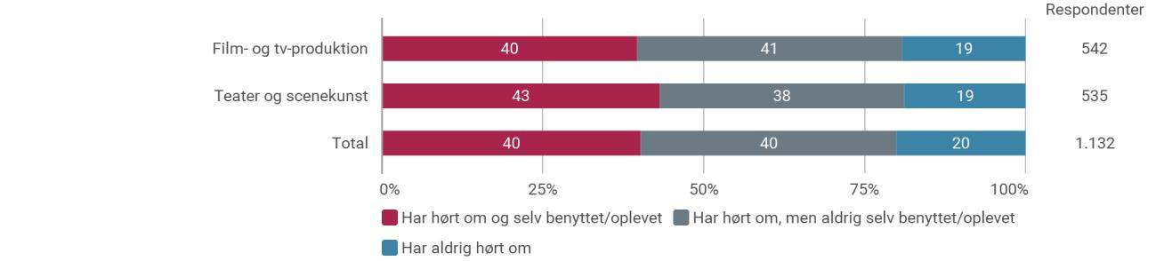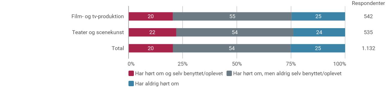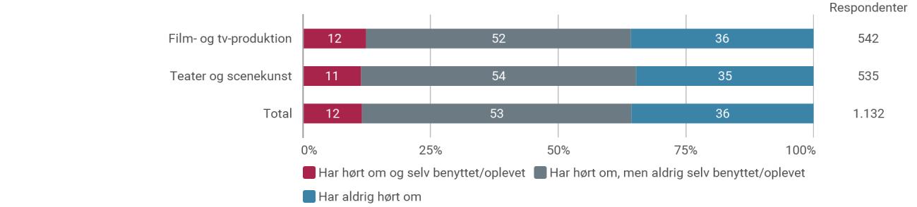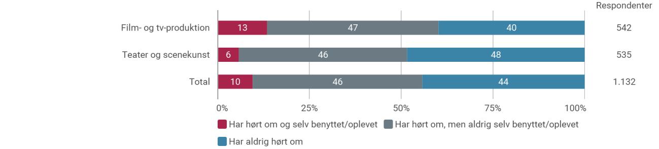 Udover hvilke initiativer respondenterne har mødt i branchen, er det ligeledes interessant at belyse hvilke former for arrangementer de eventuelt har deltaget i. Overordnet set har flere respondenter i film- og tv-produktionsbranchen (44%) deltaget i arrangementer end i teater og scenekunstbranchen (27%). Flest angiver at have deltaget i foredrag/oplæg/branchemøder/debatter. I ”Andet” kategorien angives f.eks. interne personalemøder/produktionsmøder med fokus på grænseoverskridende adfærd.