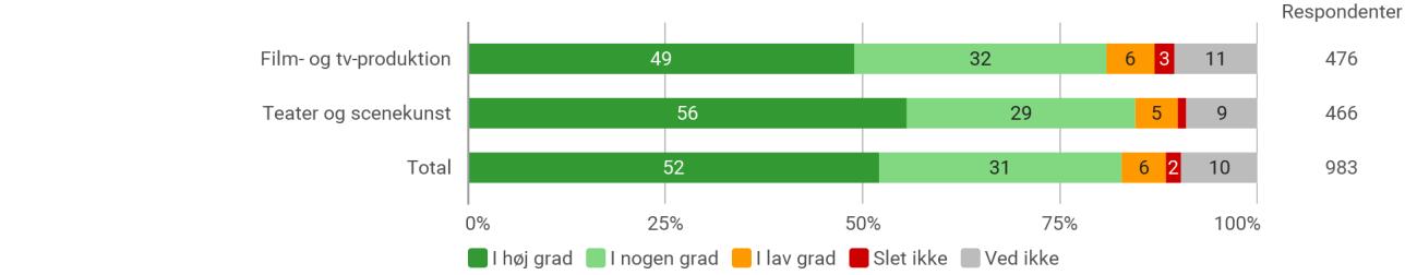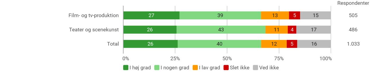 Følgende kapitel gennemgår resultaterne for undersøgelsens temaer opdelt på de to dele af branchen, hhv. film- og tv-produktion samt teater og scenekunst Opdelingen er baseret på baggrundsspørgsmålet ”Hvilken del af branchen har du primært været beskæftiget i siden 2021 og frem til i dag?”. Film- og tvproduktion består af svarkategorierne ”Fiktionsfilm og seriefiktion”, ”Dokumentarfilm og dokumentarserier” samt ”Tv-produktioner”. Teater og scenekunst består af svarkategorien ”Scenekunst”. Spørgsmålets ”Andet” kategori fremgår udelukkende i ”Total” rækken.