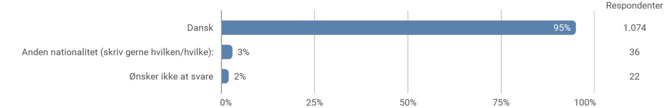 Størstedelen (95%) af undersøgelsens deltagere angiver ”Dansk”, som deres nationalitet. Under ”Andet”-kategorien angiver størstedelen andre skandinaviske lande, men andre angiver nordeuropæisk, mellemøstlig eller amerikansk nationalitet.