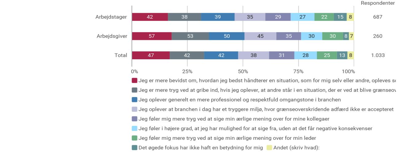 Overordnet set oplever størstedelen af respondenterne at det øgede fokus har haft en betydning for dem. Det øgede fokus har bl.a. betydet at respondenterne oplever en større bevidsthed om håndteringen af konkrete situationer, samt en større tryghed ved at gribe ind i konkrete situationer. Flere angiver at de generelt oplever en mere professionel og respektfuld omgangstone i branchen, mens mere end hver tredje oplever at branchen i dag har et tryggere miljø, hvor grænseoverskridende adfærd uacceptabelt. Nogle respondenter giver omvendt også udtryk for at det øgede fokus ikke kun er positivt. Det kan for nogle skabe en utryghed og en tilbageholdenhed ved nærkontakt af frygt for at det kan opleves som grænseoverskridende af andre.