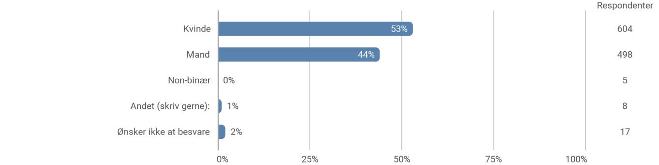53% af undersøgelsens deltagere angiver, at de identificerer sig som kvinder, mens mænd udgør 44% af deltagerne. Enkelte angiver, at de identificerer sig som nonbinær eller ”Andet”, mens få ikke ønsker at besvare spørgsmålet.