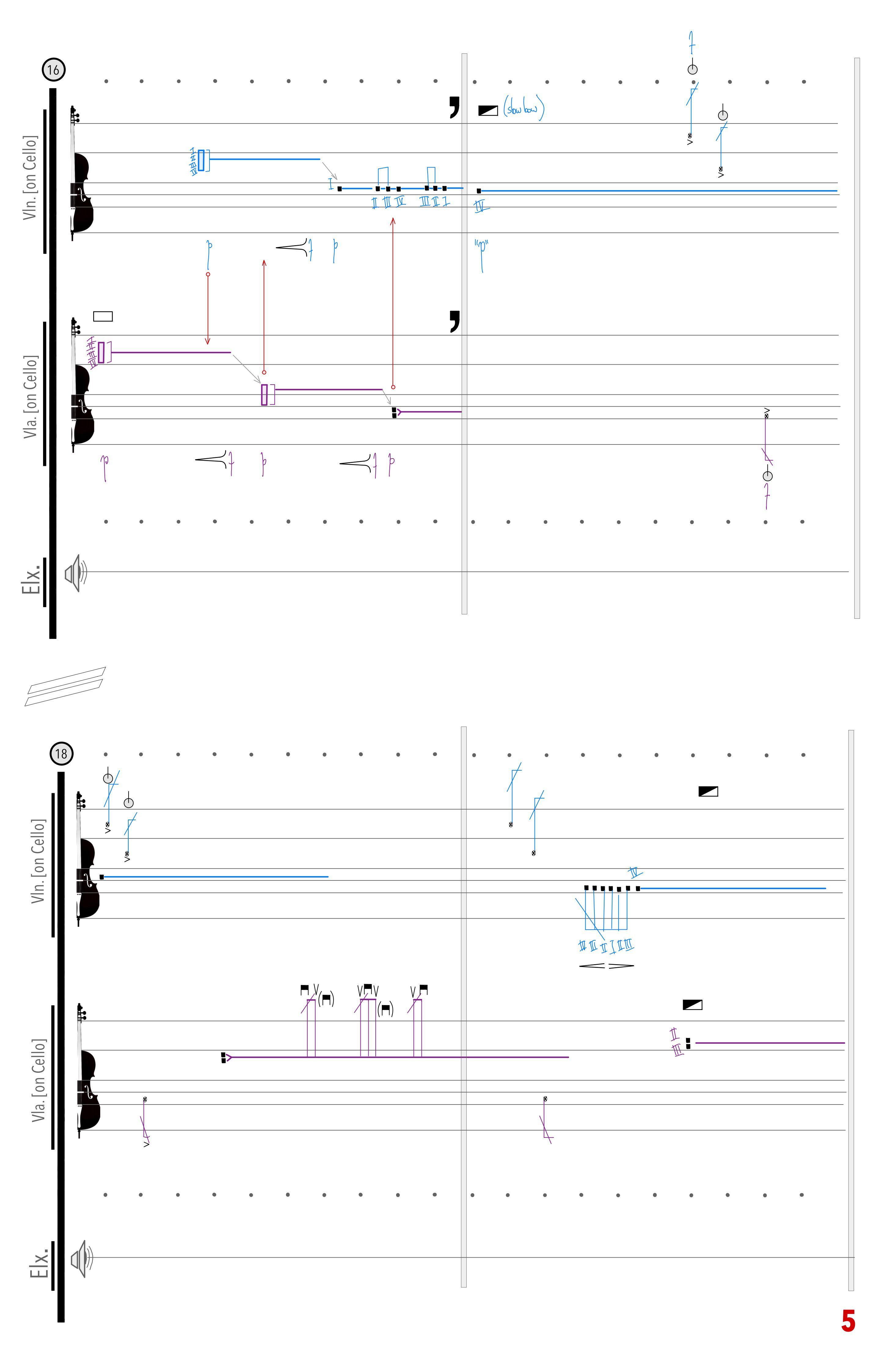 The present score was prepared to identify lines for the violinist in sky blue and lines for the violist in purple. This color-coded system is particularly design to support moments in which both instrumentalists are playing the Cello together. Additionally, red arrows are used to specify cues and simultaneous gestures between both instrumentalists (while playing the Cello or their respective instruments).
