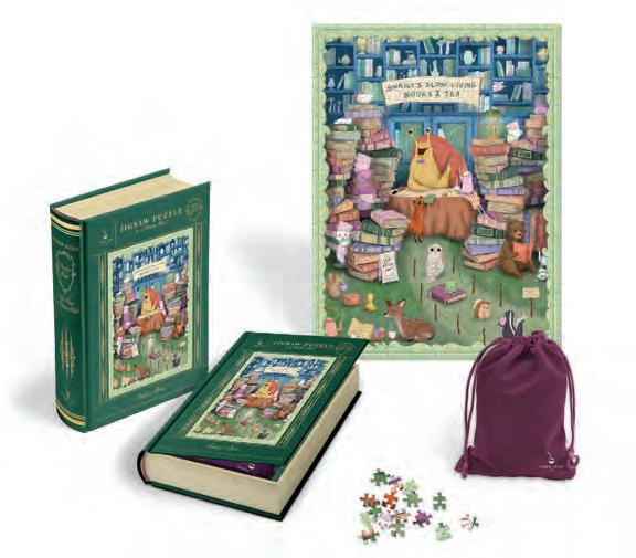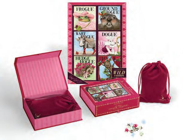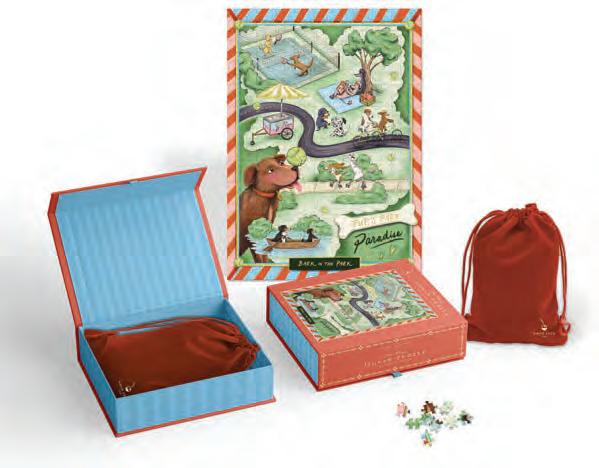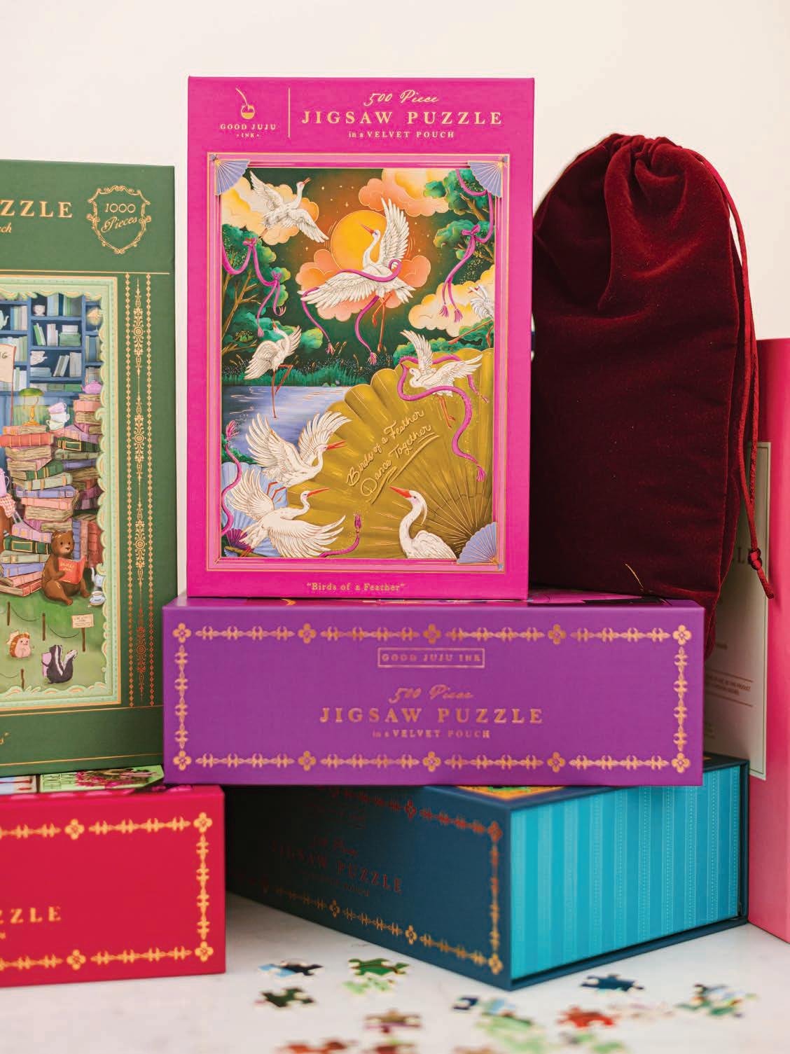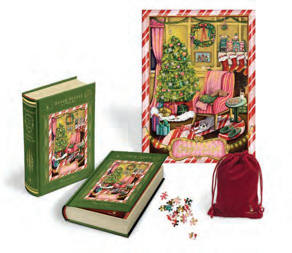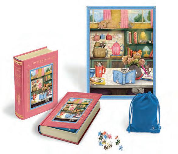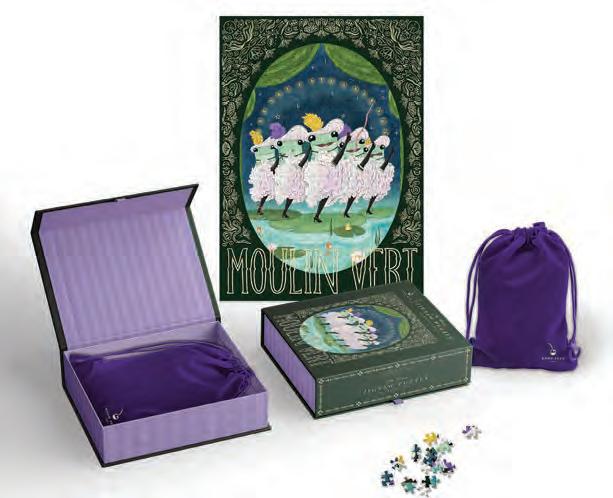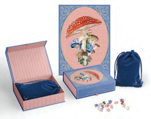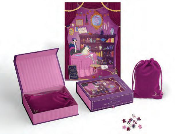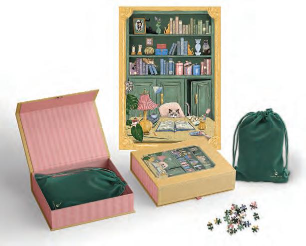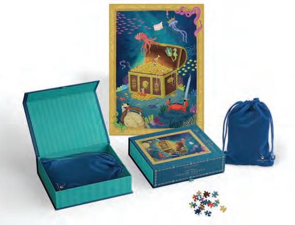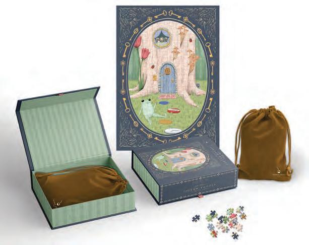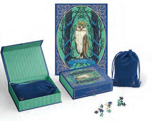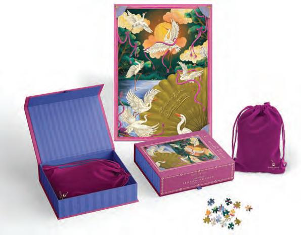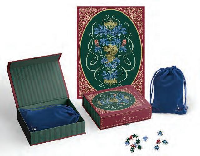 Each puzzle includes magnetic book-bound keepsake box with velvet bag. 1000 piece jigsaw puzzle, gold foil on puzzle. Completed puzzle measures 20” x 27”. Keepsake box measures 11” x 10” x 3.25”. 1000 piece puzzles will ship by the end of Q1.