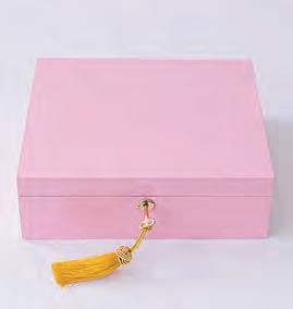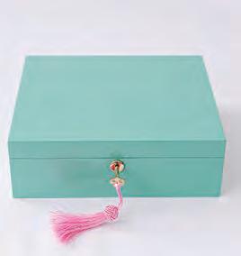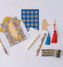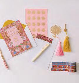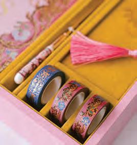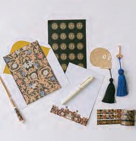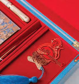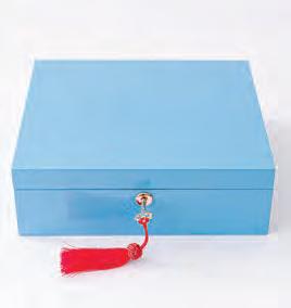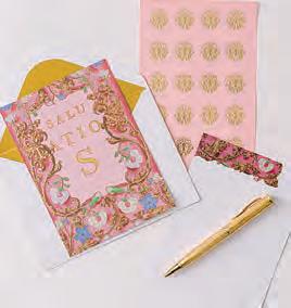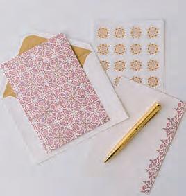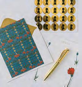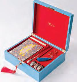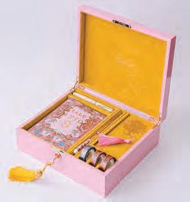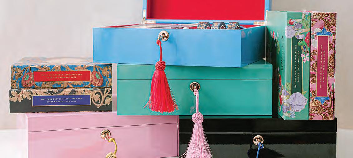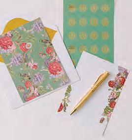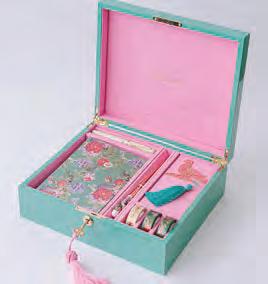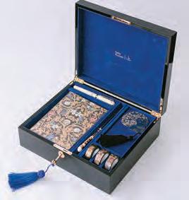 Lacquer keepsake stationery sets come with functional key and tassel, 20 gold foil-stamped, duplexed 5” x 7” writing sheets, 20 metallic lined envelopes, a sticker sheet with 20 foil-stamped die cut stickers, and 3 sets of foil-stamped washi tape. Each set has a metal bookmark with tassel, ivory-colored ballpoint pen, and a ceramic letter opener.