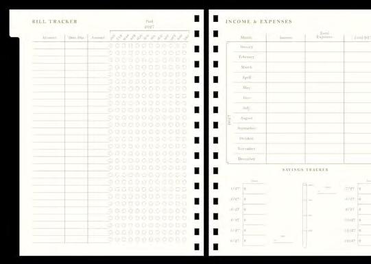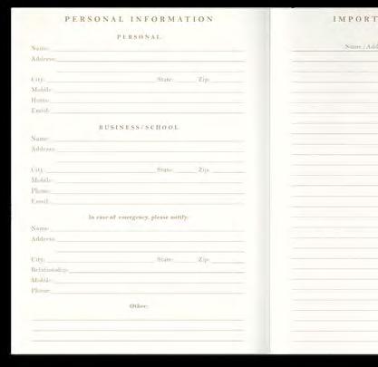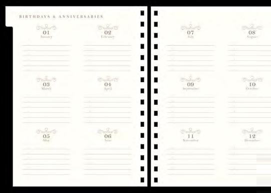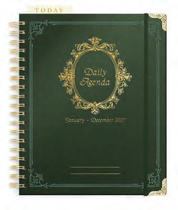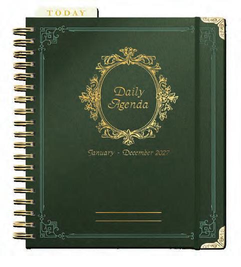 The following planners include monthly and weekly spreads, a 2-year calendar overview, a 2-year holiday overview, and several informational and contact pages. They have gold wire binding, gold foil and metal square corners on the cover, a foil-stamped sticker sheet, an interior pocket, tabbed page finders, and a clip-in spiral page marker.