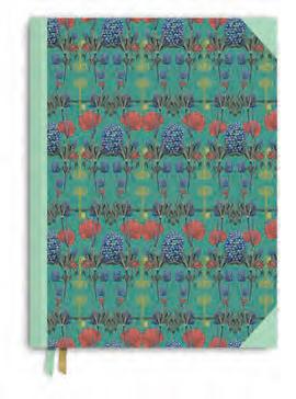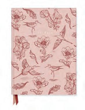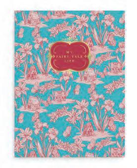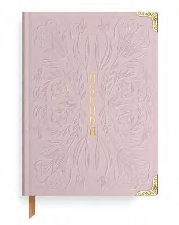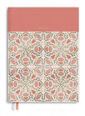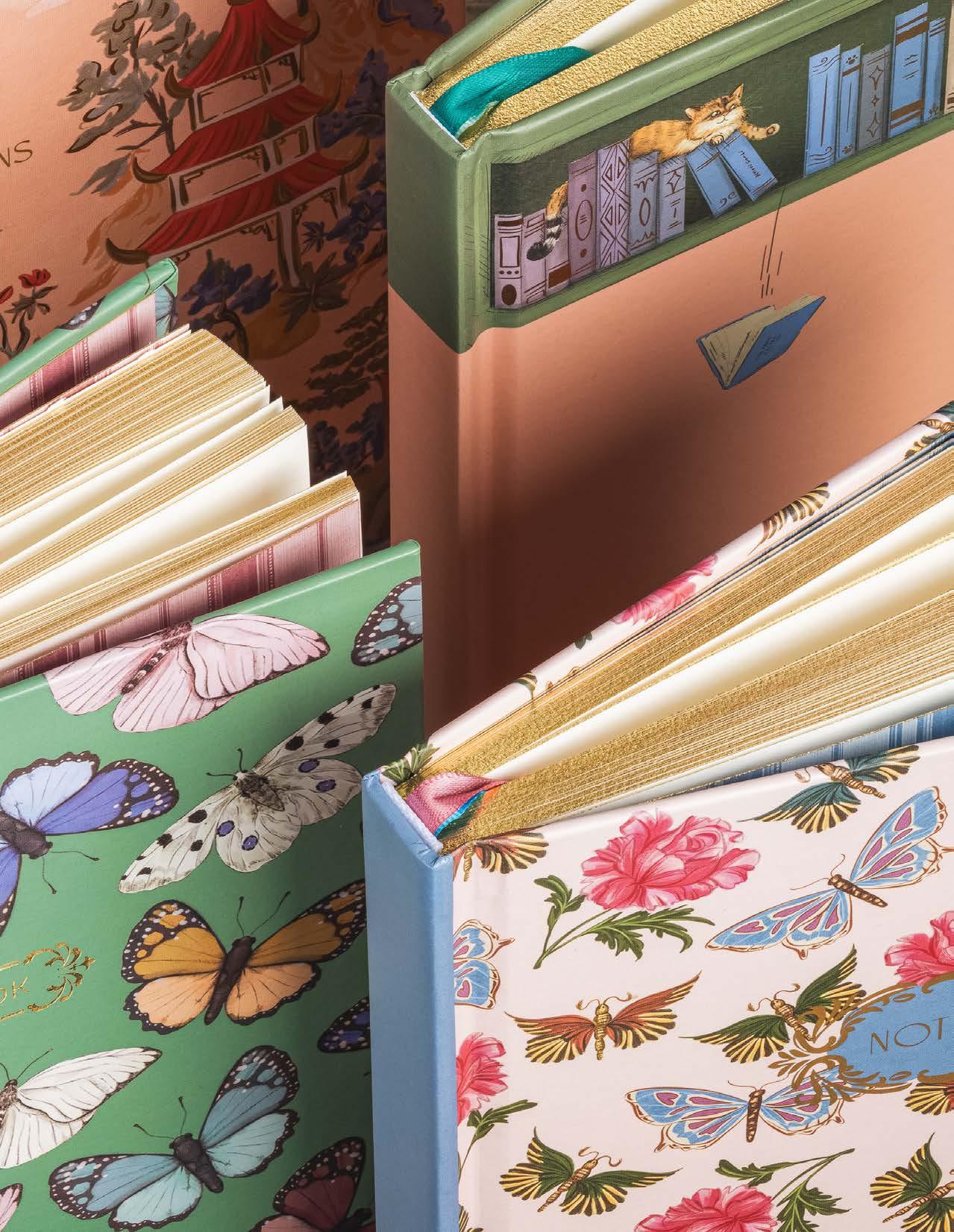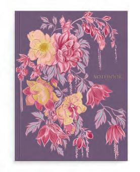 Hardcover notebooks are 6.25” x 8.25”, book bound with gold painted edges, foil elements on cover, 200 lined pages, and 2 satin ribbon bookmarks.