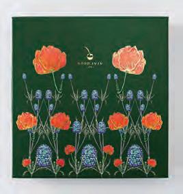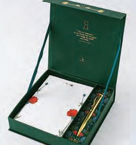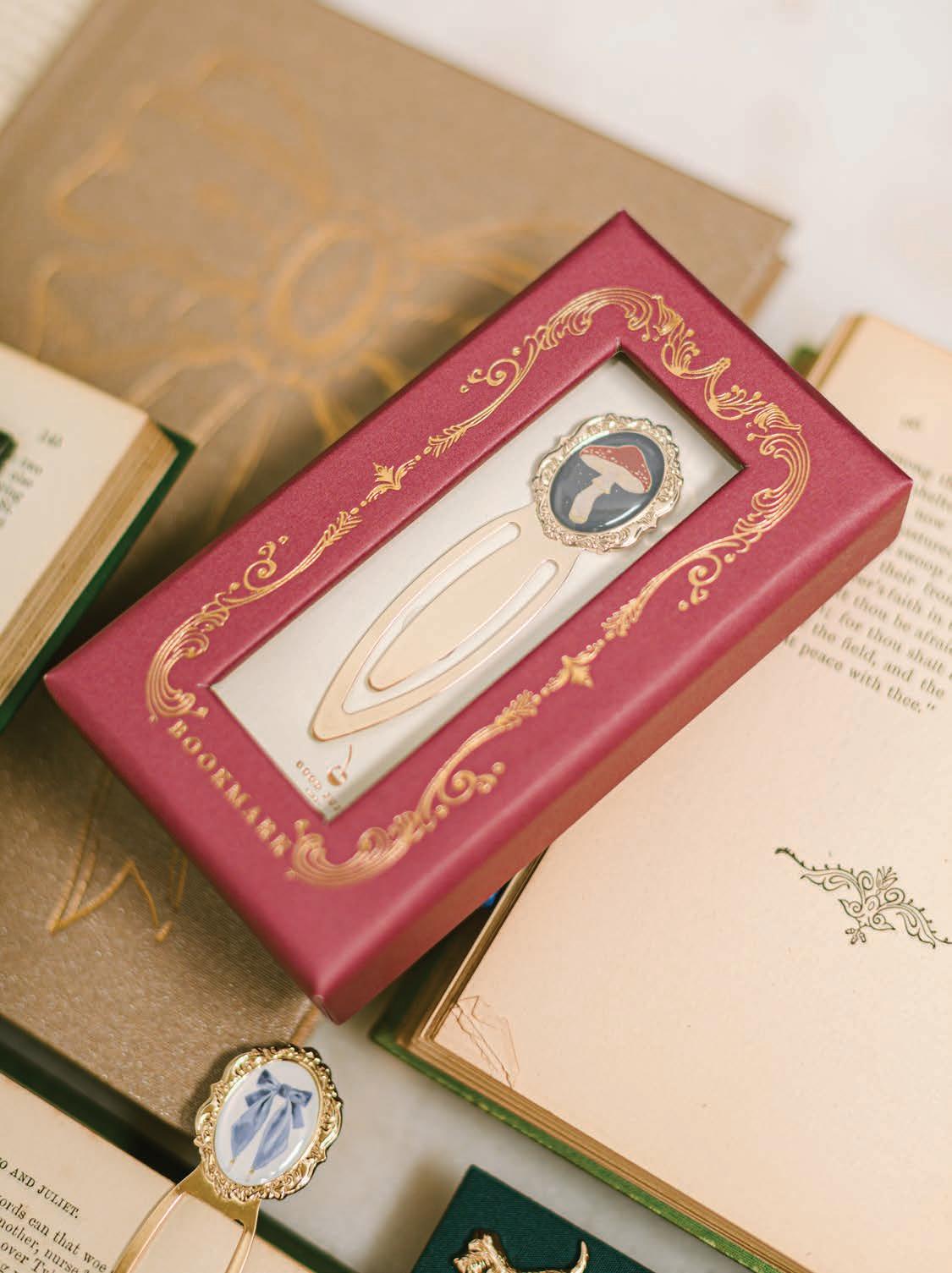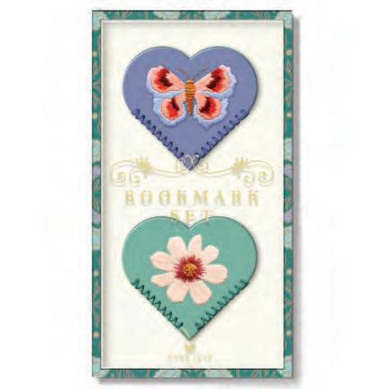 Each set comes with 2 corner bookmarks made in vegan leather and stitched together with a soft velvet backing, each featuring stitched embroidered artwork. All within a decorative paper-wrapped box with foil stamping and acetate lid measuring 3.25” x 1” x 6.125”.