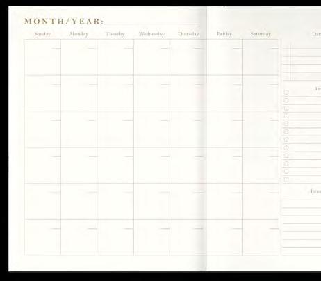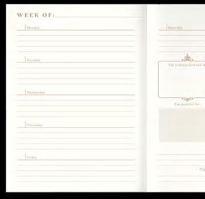 The following planners include monthly and weekly spreads, a 2-year calendar overview, a 2-year holiday overview, and several informational and contact pages. They have lay-flat binding, a foil-stamped cover, a foil-stamped sticker sheet, an interior pocket, and two ribbon markers.