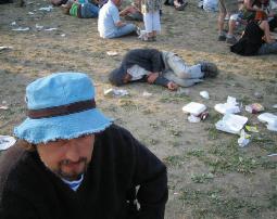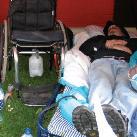 Sidste år var rigtig slem. Der faldt 100 mm regn, de første 50 mm på nogle få timer i løbet af åbningsdagen. Der var ikke tørt igen før søndag! Flere gange sad jeg så fast i mudder, at mine venner måtte løfte mig og kørestolen op i skulderhøjde for at komme igennem. Jeg kunne godt glemme alt om at køre selv. Så skal der altså rockes igennem for at holde varmen!