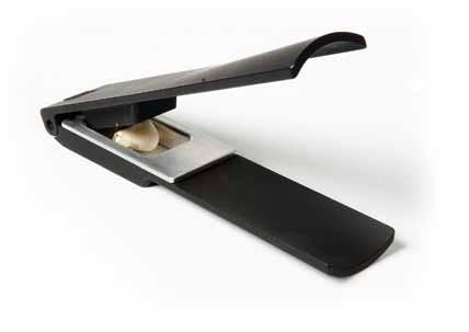 Denne patenterede hvidløgshakker er udført i et lækkert og tidløst design af den danske designer Bjarne Bo Andersen. Garlic Cutter består af et stempelergonomisk håndtag i sortlakeret aluminium samt to stærke skæreindsatser i rustfrit stål. Bruges blot en skæreindsats, skærer Garlic Cutter hvidløget i tynde skriver og bruges begge skæreindsatser, fremkommer et net, som giver små tern. Det skårne hvidløg bliver siddende på Garlic Cutter, indtil du skal bruge det og frigøres derefter let efter skæringen med en kniv eller med hånden. Den er nem at rengøre og kan også komme i opvaskemaskinen. Pris kr. 299 og den bliver leveret i en gaveæske designet af Per Arnoldi. Se juhlerdesign.dk.