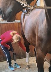 Forsidefoto Maria spænder bandagen for at gøre klar til dagens dressurtræning.
