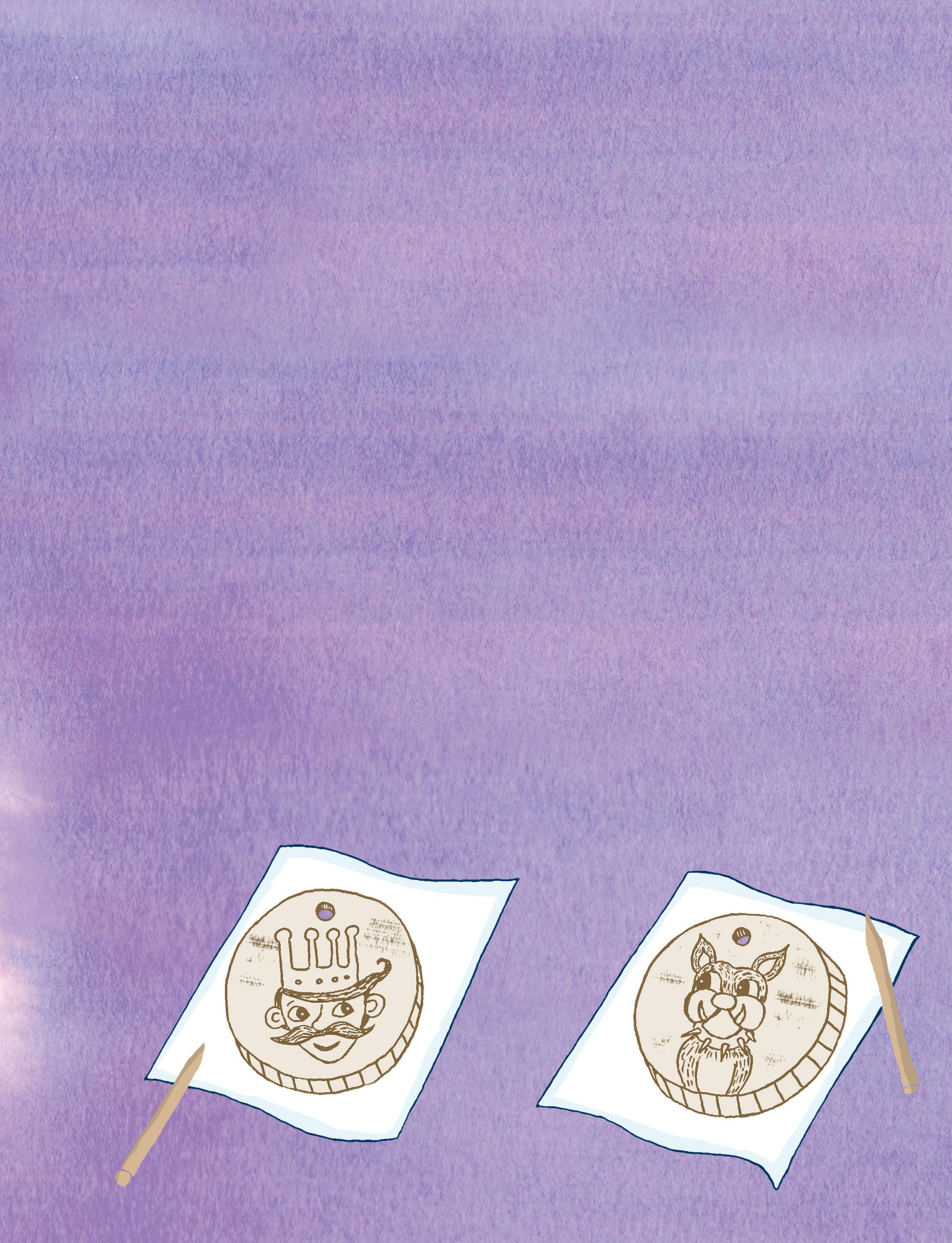 Til møntens forside former I delene til et ansigt (ansigt, øjne, næse, mund og hår), som I limer på ved at duppe med en våd finger. Overvej, om jeres mønt skal have et ansigt af kongen, dronningen, soldaten eller prinsessen?