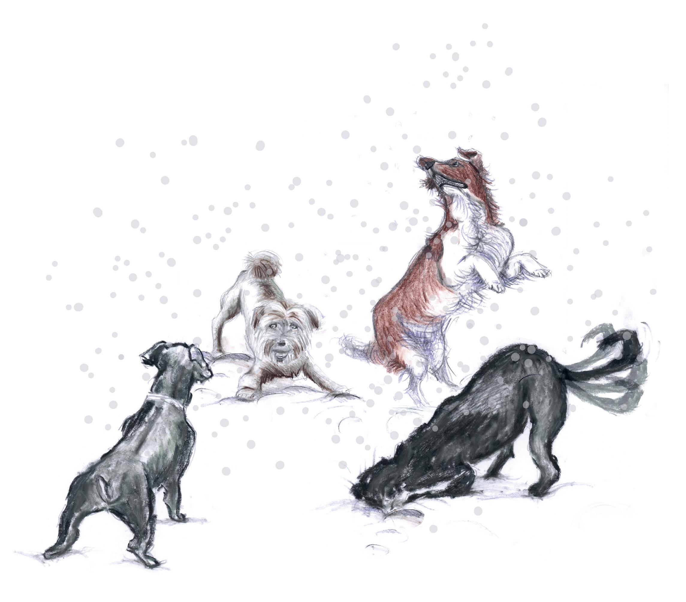 Snippende, snappende, snuppende, skubbende, hørende, førende hunde i sne.