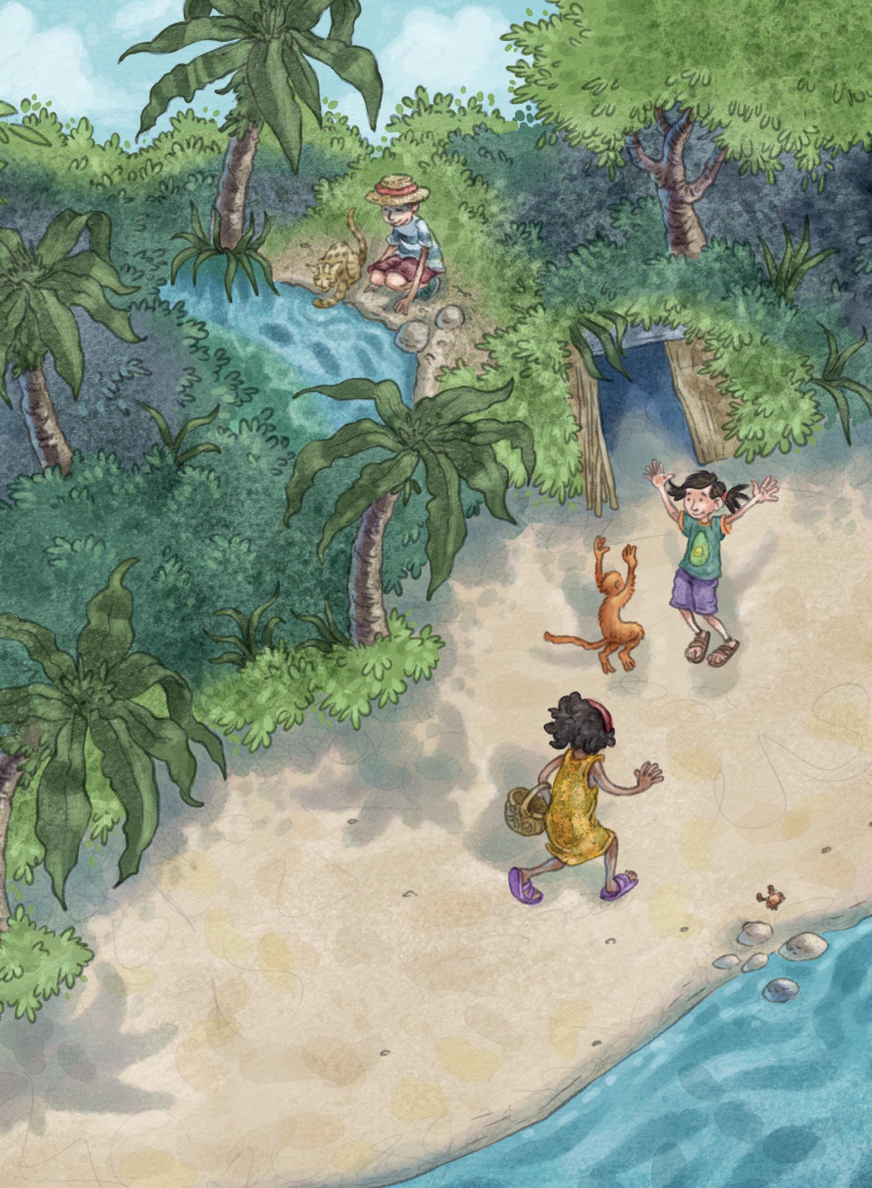 Milo fanger fisk i en lille sø. Tom ser på.