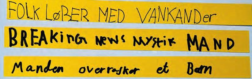 FÆLLESBOG S. 27 LEG MED FORTÆLLINGENS HANDLING Eleverne skal nu selv eksperimentere med at skrive rubrikker om nyheden Manden som havde en nerie i munden der fænger og gør læseren nysgerrig. Lad dem evt. først notere på et ark papir, og lad dem, når de har fundet frem til deres endelige breakingbjælker, skrive dem med store, sorte bogstaver på ‘bjælkerne’ øverst på side 9 scrapbogen. Naturligvis skal de bruge den viden, de har opnået om rubrikker og deres særlige måde at kommunikere på, når de formulerer deres rubrikker.