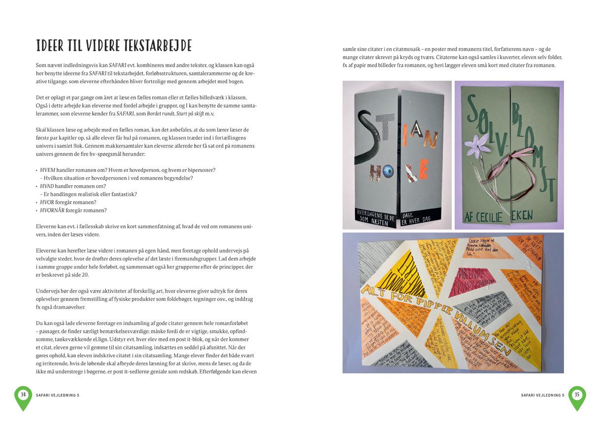DANSKLÆRERFORENINGENS FORLAG, 2024 Denne årsplan er tilpasset bogsystemet Safari 4 af Trine May og er et oplæg til, hvordan systemet kan tænkes ind i årsplanen for danskfaget i 4. klasse. Årsplanen følger bogens syv kapitler og inddrager tillige de kreative og æstetiske litteraturøvelser i Scrapbog 4 der hører til det samlede materiale. De såkaldt selvskabende øvelser. I Safari møder eleverne tidens tekster. Hermed menes nyere nordiske og tidstypiske tekster i forskellige medier, genrer og fremstillingsformer. Når en kanonforfatter præsenteres, sker det også gennem nyere tekster, fx en moderne billedbog, ligesom også urgamle fortællinger præsenteres i et tidssvarende udtryk,som fx en podcast. Hvert kapitel i Safari 4 indeholder faglige tekster, der formidler danskfagligt stof, tekster fra én af de tre tekstkategorier og oplæg til undersøgende og kreative aktiviteter. Herefter følger et forløb til fremstilling af en tekst i den tekstkategori, der har været fokus på gennem kapitlet, og endeligt evalueres der til sidst i hvert kapitel. Elevens scrapbog, Scrapbog 4, er et alternativ til den traditionelle arbejdsbog. En vigtig pointe er, at en scrapbog ikke er en arbejdsbog, hvori eleven skriftligt besvarer spørgsmål til de tekster, der arbejdes med. En scrapbog er derimod en personlig bog, hvori eleven indsætter tanker, ord, billeder, citater og forskellige produkter, som eleven producerer i arbejdet med fællesbogens tekster. Der er bevidst ikke angivet tidsestimater, da de enkelte opgaver, herunder særligt selvskabsopgaverne i scrapbogen, vil variere meget fra øvelse til øvelse og ikke mindst fra klasse til klasse. Derfor vil det være op til den enkelte lærer eller det enkelte lærerteam at fastlægge, hvor meget tid, der skal afsættes til forløbene i samspil med klassens øvrige årsplan. I Safari 4 introduceres Venteværelset der indeholder forslag til supplerende aktiviteter, som eleverne kan arbejde med, når de er færdige med den aktivitet, der lægges op til i scrapbogen. Venteværelserne findes i side for side-vejledningen og som arbejdsark bagerst i Vejledningen. Rigtig god Safari!