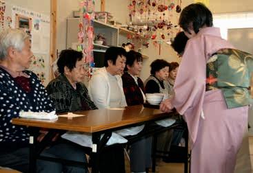 In Fukushima City, where prefabricated temporary housing has been erected in a dusty industrial suburban zone, representatives of the PS Centre were invited to join a traditional Japanese tea ceremony offered to the residents by Japanese Red Cross Society volunteers. This is one of the most widespread psychosocial activities in the area, along with Nordic walking (a form of exercise involving walking with two long walking sticks, so as to activate the upper body as well), massage, and traditional relaxation techniques.