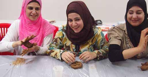Dans la pièce dite « des mères », décorée d'objets artisanaux, on trouve souvent Amal Outri. Déplacée de sa ville natale, vivant désormais à Douwaila, en zone rurale de Damas, Amal se rend souvent au centre avec son fils Abdallah, pour participer à des activités de type leçons d'anglais, artisanat et ateliers pour les mères. Au fil de ses nombreuses visites au centre, Amal a appris des techniques telles que le tissage, le filage et les travaux d'aiguille, et elle a achevé un grand nombre d'articles faits à la main.