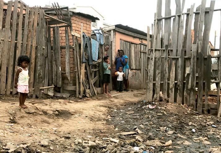 Bagefter tager vi hen til slummen Andavamamba, der i daglig tale kaldes Krokodillehullet. Her kommer mange af skolebørnene fra. Slummen er en sump, en mødding, en losseplads tæt bebygget med skure ud af alskens materialer. Et patchwork af menneskelig snilde og opfindsomhed. Det er en stor kontrast til området ved hotellet med fine regeringskontorer. Slummen er beboet af arbejdsomme mænd og kvinder, der kæmper for at holde familien oppe. At komme væk herfra er kun de få