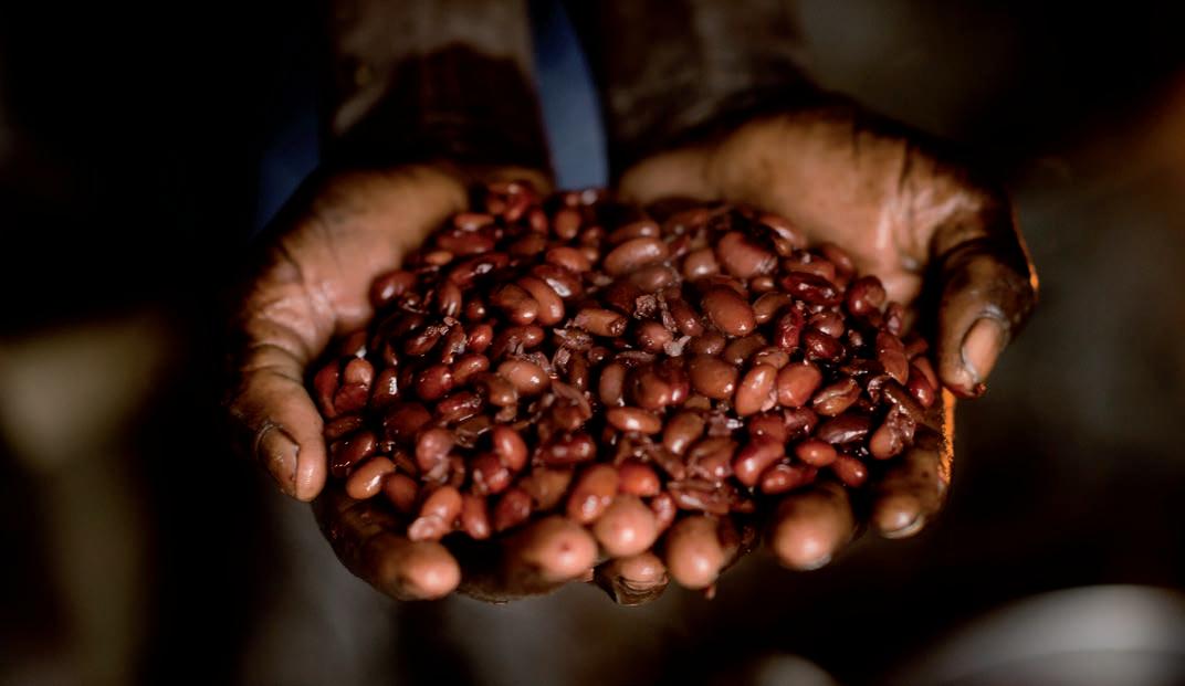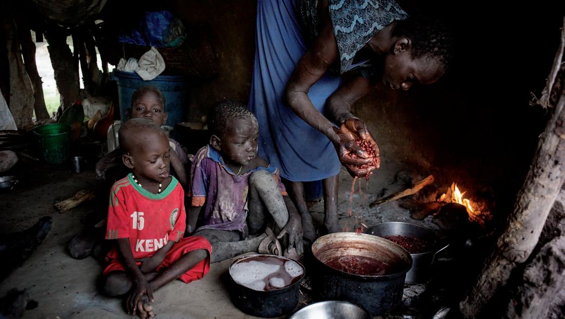 Mens hun fortæller, bøjer hun sig ind over den bulede gryde, der koger på lejet af brænde. Hun hælder koldt vand i gryden med røde bønner, og øser med hånden en portion bønner op i hånden på hvert barn.