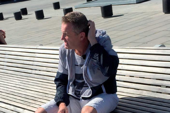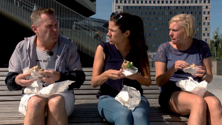 Vi falder alle tre omkuld på en bænk, da tv-holdet har forladt os. Vi sidder lidt og får skuldrene på plads og spiser så resten af vores bagels, mens vi drøfter de mange spørgsmål, og hvordan det mon vil tage sig ud i fjernsynet. Snakken løber lidt mere frit nu. Tom undrer sig over nogle indstillinger på Facebook, som vi drøfter, blandt andet det med at fortælle, at man er “i et forhold”.