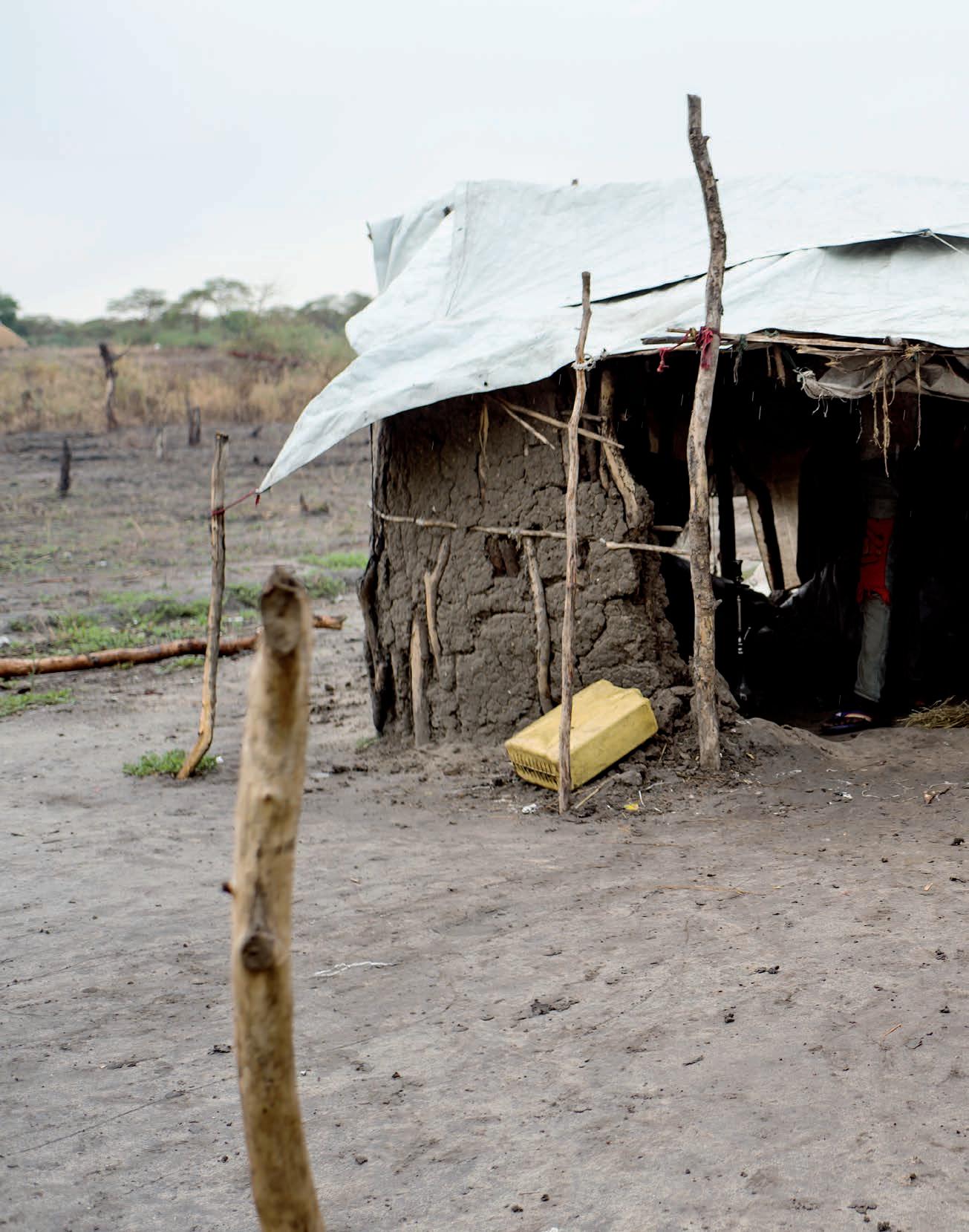 Det, der slår en først, er fugten. Trods det lille ildsted direkte på jorden, som fra tid til anden sender bølger af røg op, føles luften kold og fugtig i den dunkle hytte. Flere steder på den klamme jord samler sig små pytter af regnvand, som siler ned fra indersiden af de nødtørftigt ophængte sække, som delvis udgør taget.