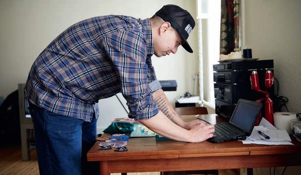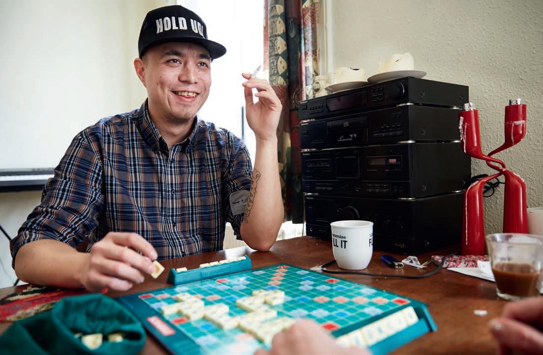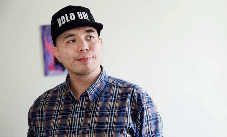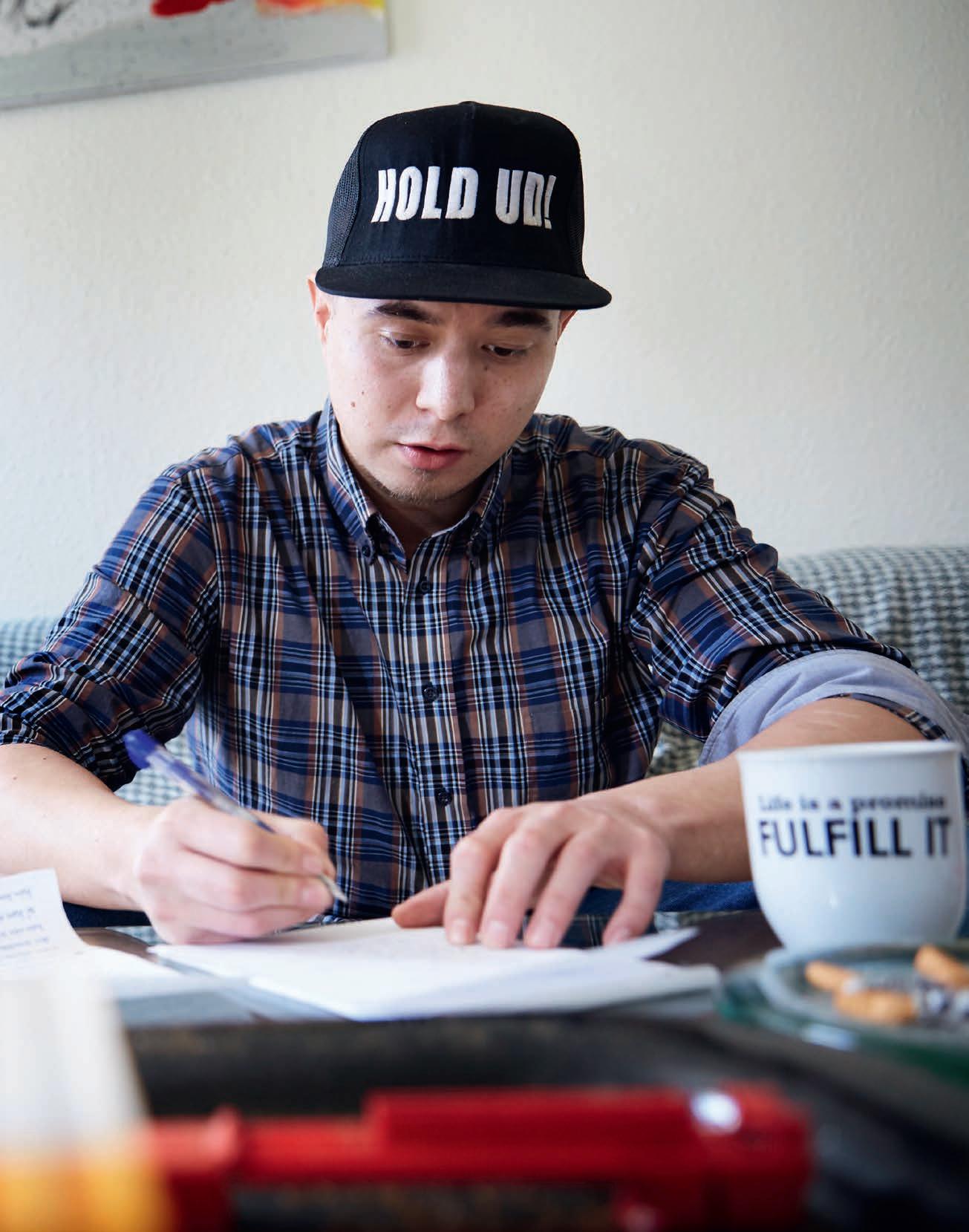 I dag får Malik uddannelsesstøtte. Han sidder ved sofabordet og skriver tekster. På hans kasket står der to simple ord. Hold ud.