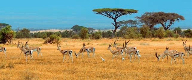1. Gazeller på savannen i Amboseli, Kenya. 2. Masai-kvinde. 3. Giraffer, Kenya.