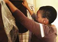 Tilbage på Mzatis værelse viser han nu tøjet frem fra sit skab.