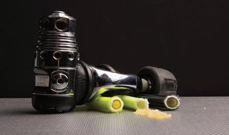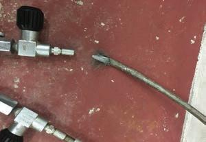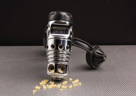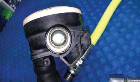 Figures A-2: braided hose failure: A) Inflator hose clearly kinked. Credit DAN, B) Branded breathing hose intact; unbranded inflator hose clearly degraded. Credit DAN; C) Regulator low pressure chamber filled with debris. Credit DAN; D) Second stage inlet clogged with hose debris. Credit DAN.